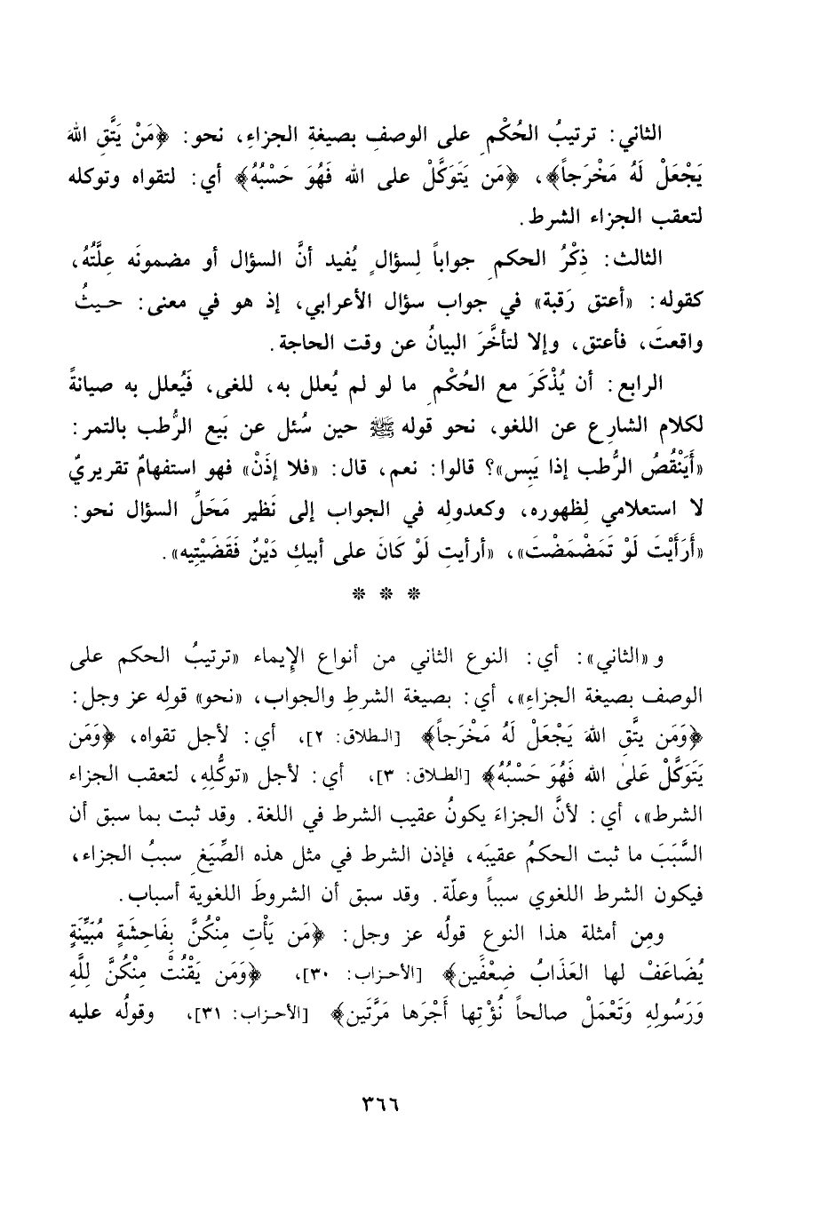 وَ «الثَّانِي» : أَيْ: النَّوْعُ الثَّانِي مِنْ أَنْوَاعِ الْإِيمَاءِ «تَرْتِيبُ الْحُكْمِ عَلَى الْوَصْفِ بِصِيغَةِ الْجَزَاءِ» أَيْ: بِصِيغَةِ الشَّرْطِ وَالْجَوَابِ، «نَحْوَ» قَوْلِهِ - عَزَّ وَجَلَّ -: {وَمَنْ يَتَّقِ اللَّهَ يَجْعَلْ لَهُ مَخْرَجًا} [الطَّلَاقِ: 2] ، أَيْ: لِأَجْلِ تَقْوَاهُ، {وَمَنْ يَتَوَكَّلْ عَلَى اللَّهِ فَهُوَ حَسْبُهُ} [الطَّلَاقِ: 3] ، أَيْ: لِأَجْلِ «تَوَكُّلِهِ، لِتَعَقُّبِ الْجَزَاءِ الشَّرْطَ» أَيْ: لِأَنَّ الْجَزَاءَ يَكُونُ عَقِيبَ الشَّرْطِ فِي اللُّغَةِ. وَقَدْ ثَبَتَ بِمَا سَبَقَ أَنَّ السَّبَبَ مَا ثَبَتَ الْحُكْمُ عَقِيبَهُ، فَإِذَنِ الشَّرْطُ فِي مِثْلِ هَذِهِ الصِّيَغِ سَبَبُ الْجَزَاءِ، فَيَكُونُ الشَّرْطُ اللُّغَوِيُّ سَبَبًا وَعِلَّةً. وَقَدْ سَبَقَ أَنَّ الشُّرُوطَ اللُّغَوِيَّةَ أَسْبَابٌ.