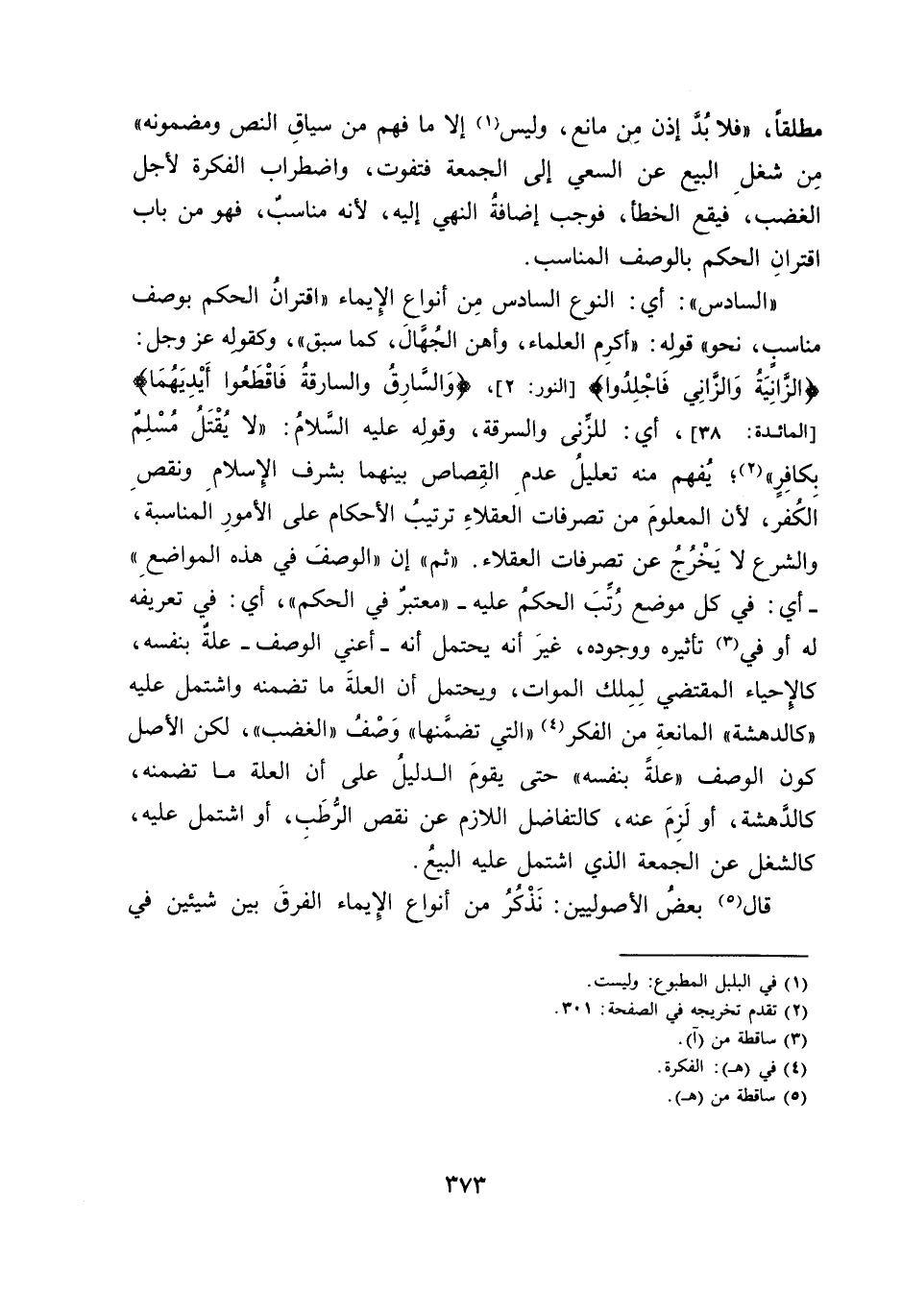 " السَّادِسُ ": أَيْ: النَّوْعُ السَّادِسُ مِنْ أَنْوَاعِ الْإِيمَاءِ " اقْتِرَانُ الْحُكْمِ بِوَصْفٍ مُنَاسِبٍ، نَحْوَ " قَوْلِهِ: " أَكْرِمِ الْعُلَمَاءَ، وَأَهِنِ الْجُهَّالَ، كَمَا سَبَقَ " كَقَوْلِهِ - عَزَّ وَجَلَّ -: {الزَّانِيَةُ وَالزَّانِي فَاجْلِدُوا} [النُّورِ: 2] ، {وَالسَّارِقُ وَالسَّارِقَةُ فَاقْطَعُوا أَيْدِيَهُمَا} [الْمَائِدَةِ: 38] ، أَيْ: لِلزِّنَى وَالسَّرِقَةِ، وَقَوْلُهُ - عَلَيْهِ السَّلَامُ -: لَا يُقْتَلُ مُسْلِمٌ بِكَافِرٍ ; يُفْهَمُ مِنْهُ تَعْلِيلُ عَدَمِ الْقِصَاصِ بَيْنَهُمَا بِشَرَفِ الْإِسْلَامِ وَنَقْصِ الْكُفْرِ، لِأَنَّ الْمَعْلُومَ مِنْ تَصَرُّفَاتِ الْعُقَلَاءِ تَرْتِيبُ الْأَحْكَامِ عَلَى الْأُمُورِ الْمُنَاسِبَةِ، وَالشَّرْعُ لَا يَخْرُجُ عَنْ تَصَرُّفَاتِ الْعُقَلَاءِ. " ثُمَّ " إِنَّ " الْوَصْفَ فِي هَذِهِ الْمَوَاضِعِ " أَيْ: فِي كُلِّ مَوْضِعٍ رُتِّبَ الْحُكْمُ عَلَيْهِ " مُعْتَبَرٌ فِي الْحُكْمِ " أَيْ: فِي تَعْرِيفِهِ لَهُ أَوْ فِي تَأْثِيرِهِ وَوُجُودِهِ، غَيْرَ أَنَّهُ يَحْتَمِلُ أَنَّهُ - أَعْنِي الْوَصْفَ - عِلَّةٌ بِنَفْسِهِ، كَالْإِحْيَاءِ الْمُقْتَضِي لِمِلْكِ الْمَوَاتِ، وَيُحْتَمَلُ أَنَّ الْعِلَّةَ مَا تَضَمَّنَهُ وَاشْتَمَلَ عَلَيْهِ " كَالدَّهْشَةِ " الْمَانِعَةِ مِنَ الْفِكْرِ " الَّتِي تَضَمَّنَهَا " وَصْفُ " الْغَضَبِ " لَكِنَّ الْأَصْلَ كَوْنُ الْوَصْفِ " عِلَّةً بِنَفْسِهِ " حَتَّى يَقُومَ الدَّلِيلُ عَلَى أَنَّ الْعِلَّةَ مَا تَضَمَّنَهُ، كَالدَّهْشَةِ، أَوْ لَزِمَ عَنْهُ، كَالتَّفَاضُلِ اللَّازِمِ عَنْ نَقْصِ الرُّطَبِ، أَوِ اشْتَمَلَ عَلَيْهِ، كَالشُّغْلِ عَنِ الْجُمُعَةِ الَّذِي اشْتَمَلَ عَلَيْهِ الْبَيْعُ.