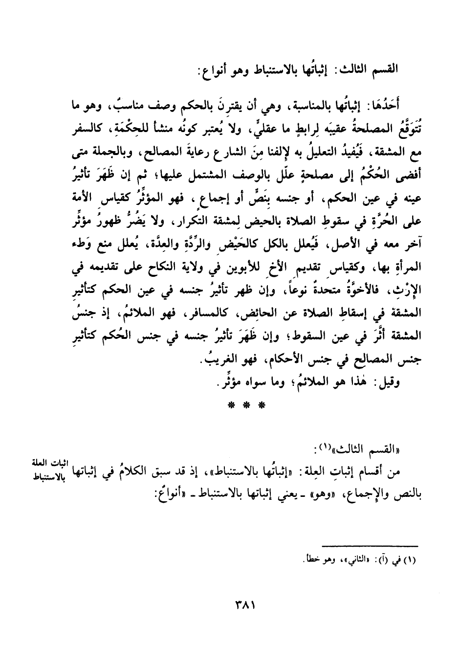 مِنْ أَقْسَامِ إِثْبَاتِ الْعِلَّةِ: «إِثْبَاتُهَا بِالِاسْتِنْبَاطِ» ، إِذْ قَدْ سَبَقَ الْكَلَامُ فِي إِثْبَاتِهَا بِالنَّصِّ وَالْإِجْمَاعِ، «وَهُوَ» - يَعْنِي إِثْبَاتَهَا بِالِاسْتِنْبَاطِ - «أَنْوَاعٌ: