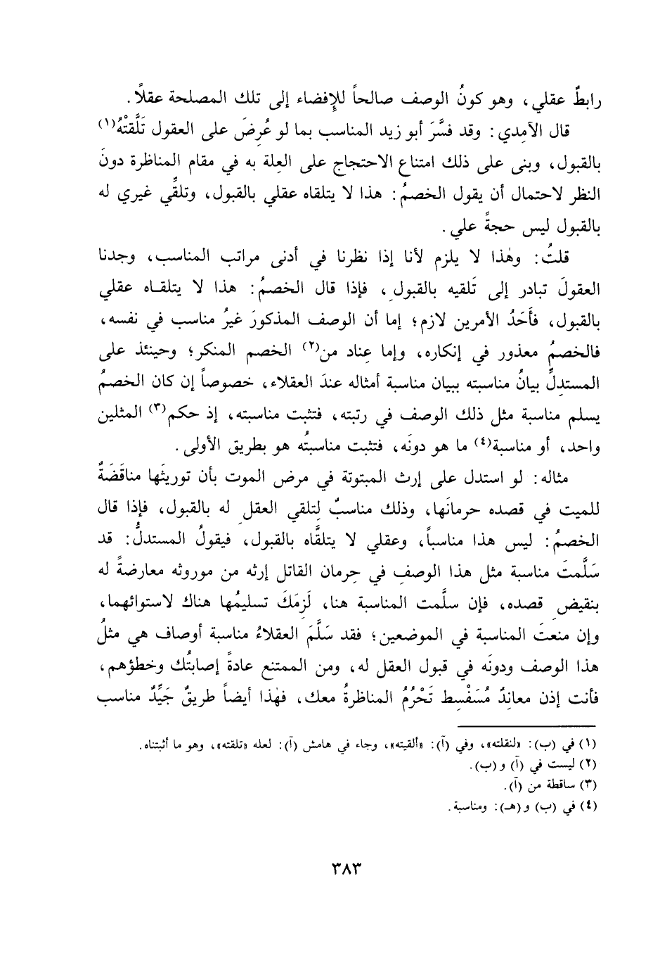 قَالَ الْآمِدِيُّ: وَقَدْ فَسَّرَ أَبُو زَيْدٍ الْمُنَاسِبَ بِمَا لَوْ عُرِضَ عَلَى الْعُقُولِ تَلَقَّتْهُ بِالْقَبُولِ، وَبَنَى عَلَى ذَلِكَ امْتِنَاعَ الِاحْتِجَاجِ عَلَى الْعِلَّةِ بِهِ فِي مَقَامِ الْمُنَاظَرَةِ دُونَ النَّظَرِ لِاحْتِمَالِ أَنْ يَقُولَ الْخَصْمُ: هَذَا لَا يَتَلَقَّاهُ عَقْلِي بِالْقَبُولِ، وَتَلَقِّي غَيْرِي لَهُ بِالْقَبُولِ لَيْسَ حُجَّةً عَلَيَّ.