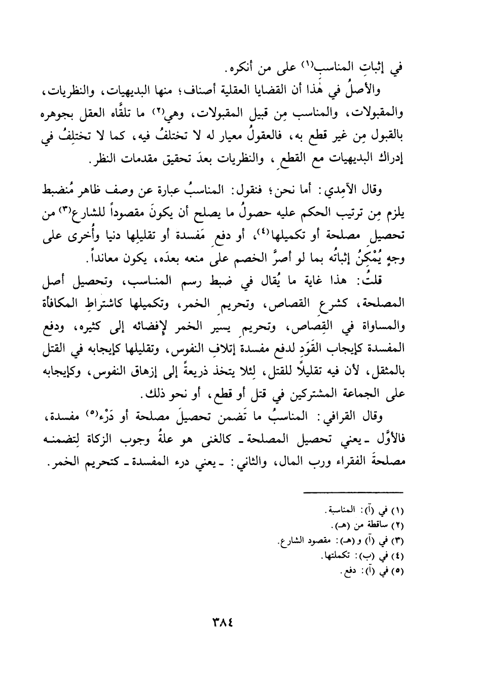 قُلْتُ: هَذَا غَايَةُ مَا يُقَالُ فِي ضَبْطِ رَسْمِ الْمُنَاسِبِ، وَتَحْصِيلُ أَصْلِ الْمَصْلَحَةِ، كَشَرْعِ الْقِصَاصِ، وَتَحْرِيمِ الْخَمْرِ، وَتَكْمِيلِهَا كَاشْتِرَاطِ الْمُكَافَأَةِ وَالْمُسَاوَاةِ فِي الْقِصَاصِ، وَتَحْرِيمِ يَسِيرِ الْخَمْرِ لِإِفْضَائِهِ إِلَى كَثِيرِهِ، وَدَفْعِ الْمَفْسَدَةِ كَإِيجَابِ الْقَوْدِ لِدَفْعِ مَفْسَدَةِ إِتْلَافِ النُّفُوسِ، وَتَقْلِيلِهَا كَإِيجَابِهِ فِي الْقَتْلِ بِالْمُثْقَلِ، لِأَنَّ فِيهِ تَقْلِيلًا لِلْقَتْلِ، لِئَلَّا يُتَّخَذَ ذَرِيعَةً إِلَى إِزْهَاقِ النُّفُوسِ، وَكَإِيجَابِهِ عَلَى الْجَمَاعَةِ الْمُشْتَرِكِينَ فِي قَتْلٍ أَوْ قَطْعٍ، أَوْ نَحْوِ ذَلِكَ.
