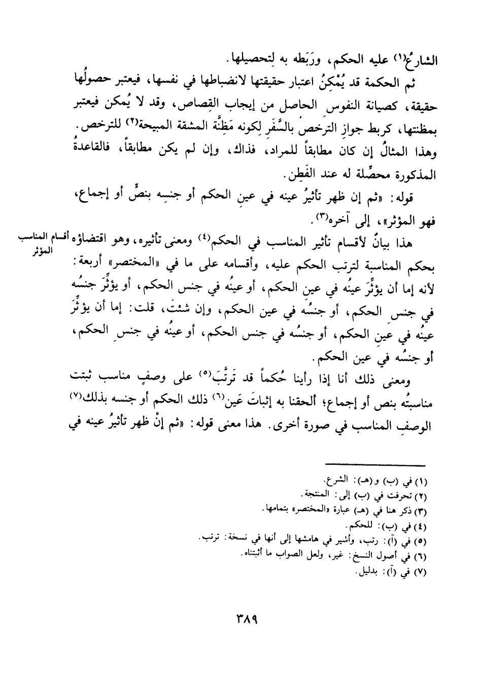 هَذَا بَيَانٌ لِأَقْسَامِ تَأْثِيرِ الْمُنَاسِبِ فِي الْحُكْمِ وَمَعْنَى تَأْثِيرِهِ، وَهُوَ اقْتِضَاؤُهُ بِحُكْمِ الْمُنَاسَبَةِ لِتَرَتُّبِ الْحُكْمِ عَلَيْهِ، وَأَقْسَامُهُ عَلَى مَا فِي «الْمُخْتَصَرِ» أَرْبَعَةٌ: لِأَنَّهُ إِمَّا أَنْ يُؤَثِّرَ عَيْنُهُ فِي عَيْنِ الْحُكْمِ، أَوْ عَيْنُهُ فِي جِنْسِ الْحُكْمِ، أَوْ يُؤَثِّرَ جِنْسُهُ فِي جِنْسِ الْحُكْمِ، أَوْ جِنْسُهُ فِي عَيْنِ الْحُكْمِ، وَإِنْ شِئْتَ، قُلْتَ: إِمَّا أَنْ يُؤَثِّرَ عَيْنُهُ فِي عَيْنِ الْحُكْمِ، أَوْ جِنْسُهُ فِي جِنْسِ الْحُكْمِ، أَوْ عَيْنُهُ فِي جِنْسِ الْحُكْمِ، أَوْ جِنْسُهُ فِي عَيْنِ الْحُكْمِ.