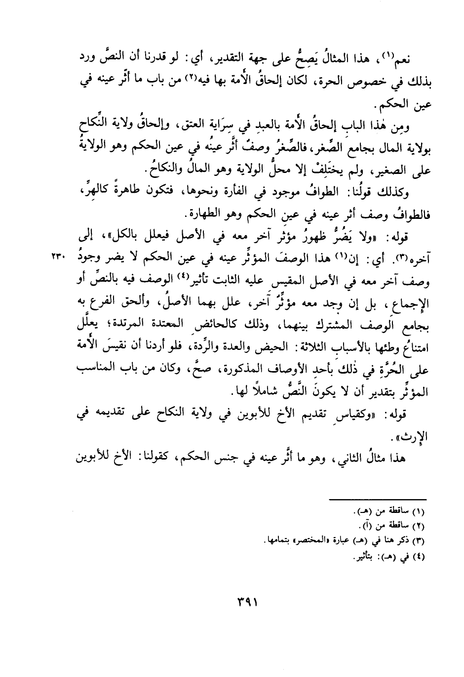 نَعَمْ، هَذَا الْمِثَالُ يَصِحُّ عَلَى جِهَةِ التَّقْدِيرِ، أَيْ: لَوْ قَدَّرْنَا أَنَّ النَّصَّ وَرَدَ بِذَلِكَ فِي خُصُوصِ الْحُرَّةِ، لَكَانَ إِلْحَاقُ الْأَمَةِ بِهَا فِيهِ مِنْ بَابِ مَا أَثَّرَ عَيْنُهُ فِي عَيْنِ الْحُكْمِ.