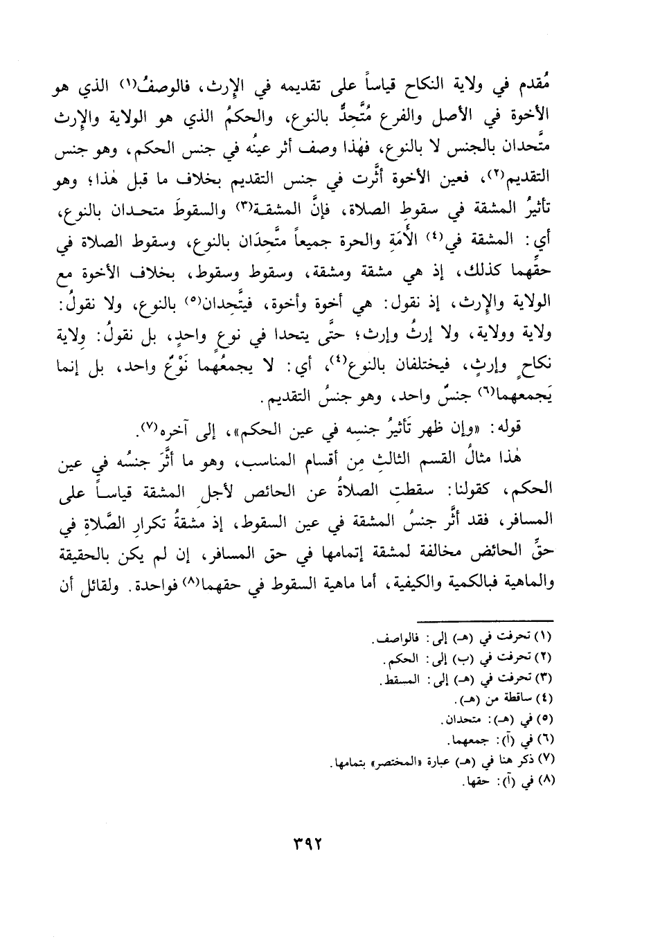 هَذَا مِثَالُ الْقِسْمِ الثَّالِثِ مِنْ أَقْسَامِ الْمُنَاسِبِ، وَهُوَ مَا أَثَّرَ جِنْسُهُ فِي عَيْنِ الْحُكْمِ، كَقَوْلِنَا: سَقَطَتِ الصَّلَاةُ عَنِ الْحَائِضِ لِأَجْلِ الْمَشَقَّةِ قِيَاسًا عَلَى الْمُسَافِرِ، فَقَدْ أَثَّرَ جِنْسُ الْمَشَقَّةِ فِي عَيْنِ السُّقُوطِ، إِذْ مَشَقَّةُ تَكْرَارِ الصَّلَاةِ فِي حَقِّ الْحَائِضِ مُخَالِفَةٌ لِمَشَقَّةِ إِتْمَامِهَا فِي حَقِّ الْمُسَافِرِ، إِنْ لَمْ يَكُنْ بِالْحَقِيقَةِ وَالْمَاهِيَّةِ فَبِالْكَمِّيَّةِ وَالْكَيْفِيَّةِ، أَمَّا مَاهِيَّةُ السُّقُوطِ فِي حَقِّهِمَا فَوَاحِدَةٌ. وَلِقَائِلٍ أَنْ