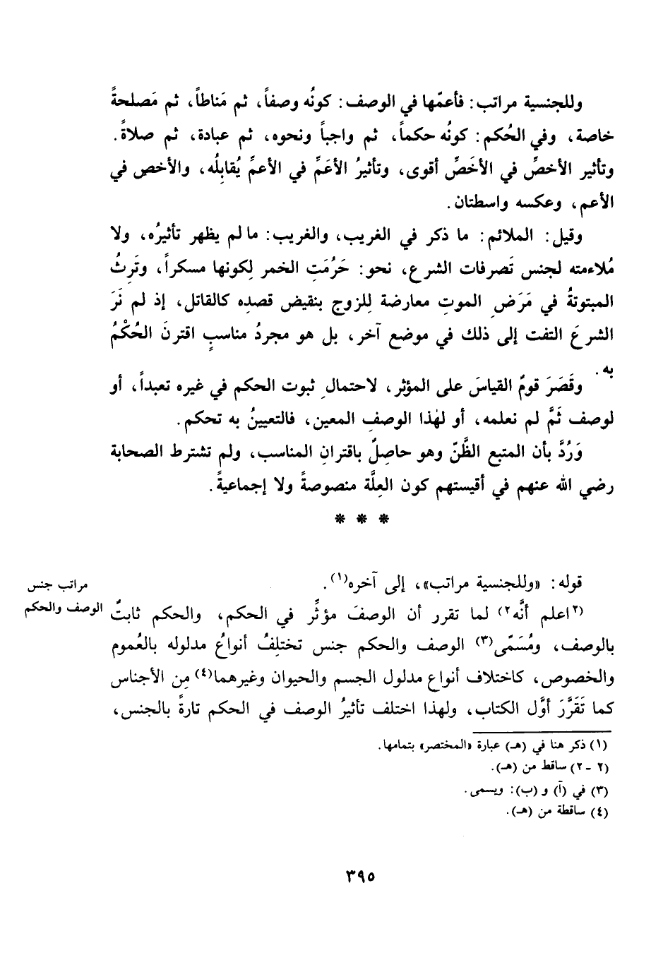 وَلِلْجِنْسِيَّةِ مَرَاتِبٌ: فَأَعَمُّهَا فِي الْوَصْفِ: كَوْنُهُ وَصْفًا، ثُمَّ مَنَاطًا، ثُمَّ مَصْلَحَةً خَاصَّةً، وَفِي الْحُكْمِ: كَوْنُهُ حُكْمًا، ثُمَّ وَاجِبًا وَنَحْوَهُ، ثُمَّ عِبَادَةً، ثُمَّ صَلَاةً.