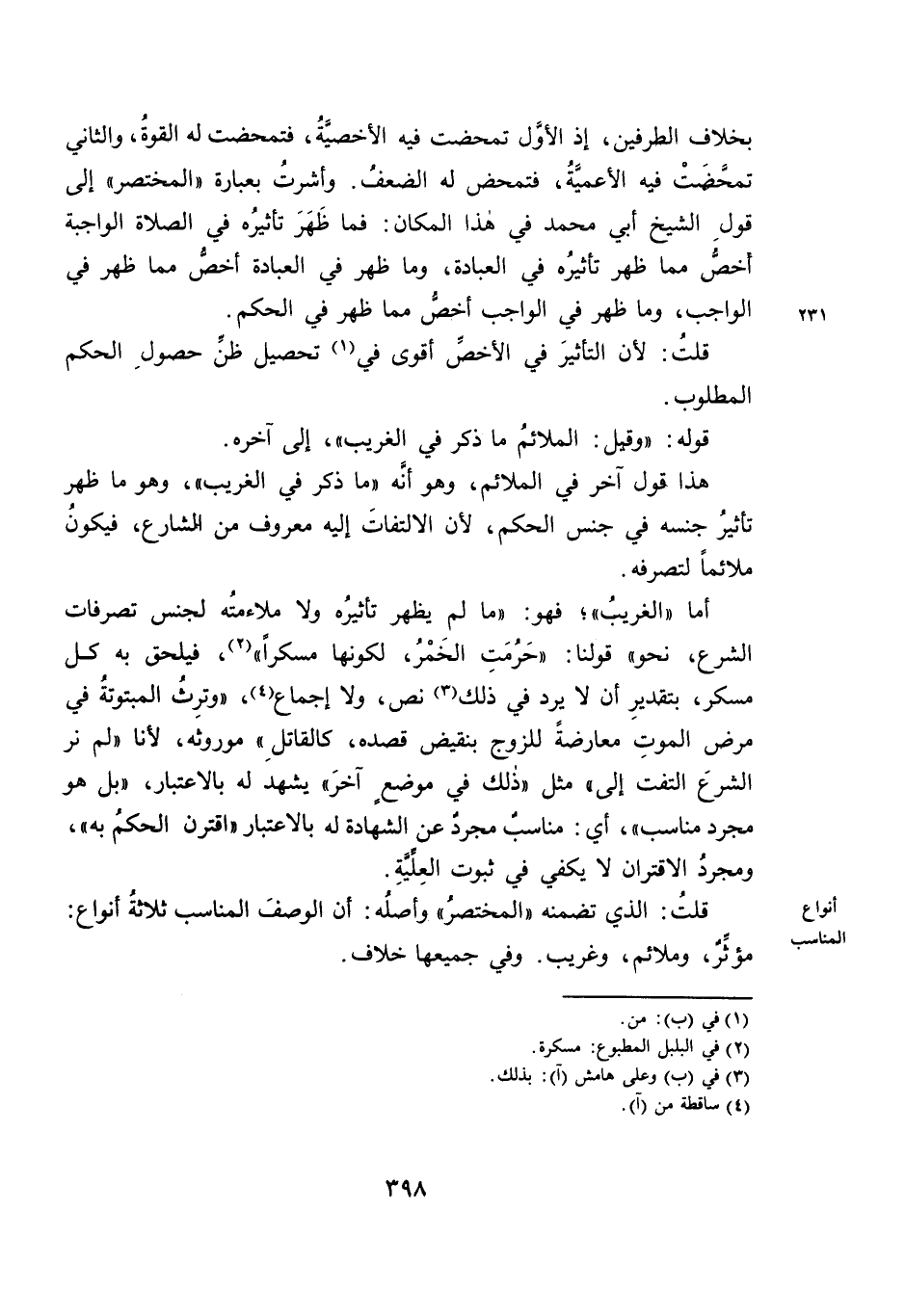 قُلْتُ: الَّذِي تَضَمَّنَهُ «الْمُخْتَصَرُ» وَأَصْلُهُ: أَنَّ الْوَصْفَ الْمُنَاسِبَ ثَلَاثَةُ أَنْوَاعٍ: مُؤَثِّرٌ وَمُلَائِمٌ وَغَرِيبٌ. وَفِي جَمِيعِهَا خِلَافٌ.