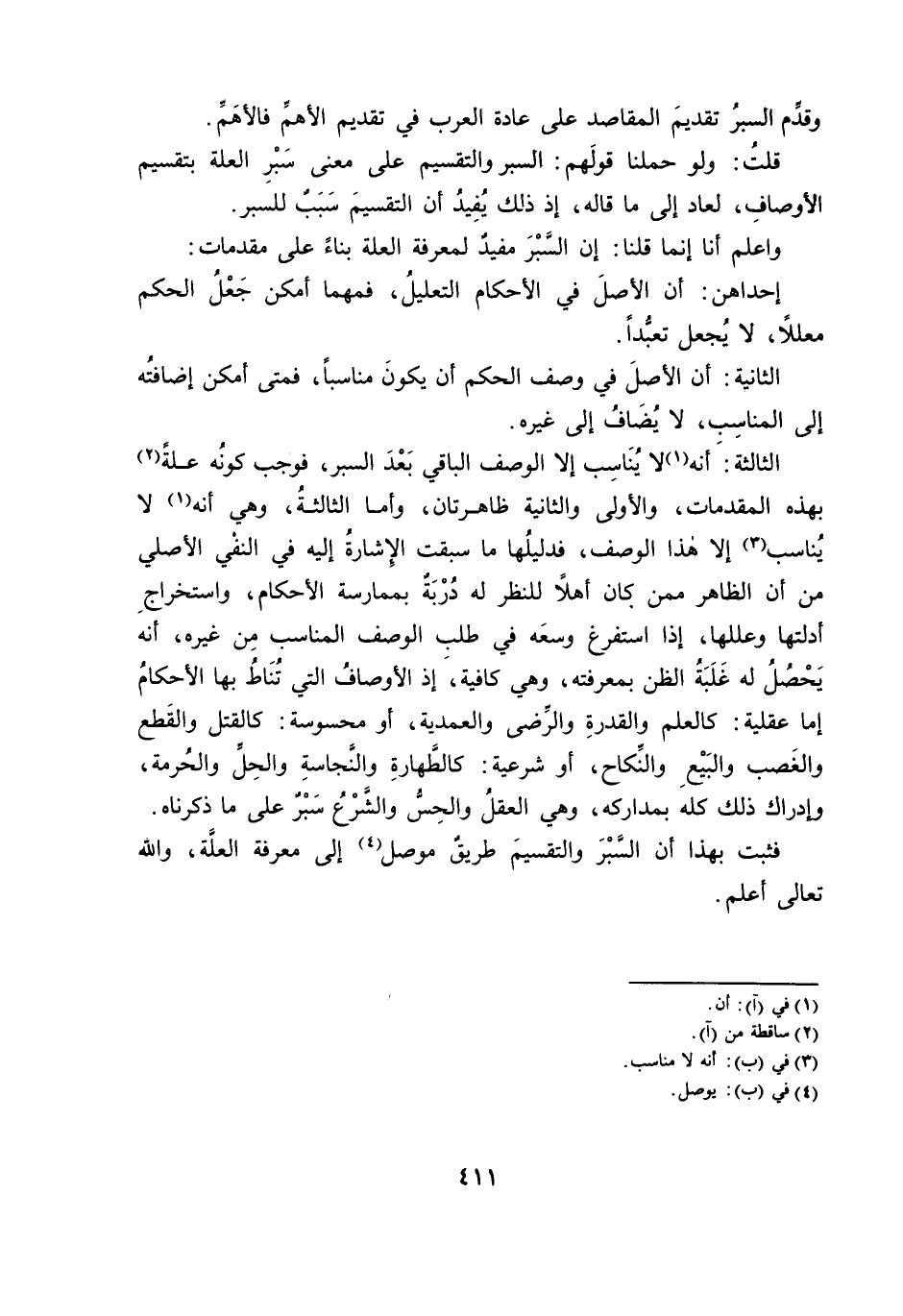 قُلْتُ: وَلَوْ حَمَلْنَا قَوْلَهُمْ: السَّبْرُ وَالتَّقْسِيمُ عَلَى مَعْنَى سَبْرِ الْعِلَّةِ بِتَقْسِيمِ الْأَوْصَافِ، لَعَادَ إِلَى مَا قَالَهُ، إِذْ ذَلِكَ يُفِيدُ أَنَّ التَّقْسِيمَ سَبَبٌ لِلسَّبْرِ.