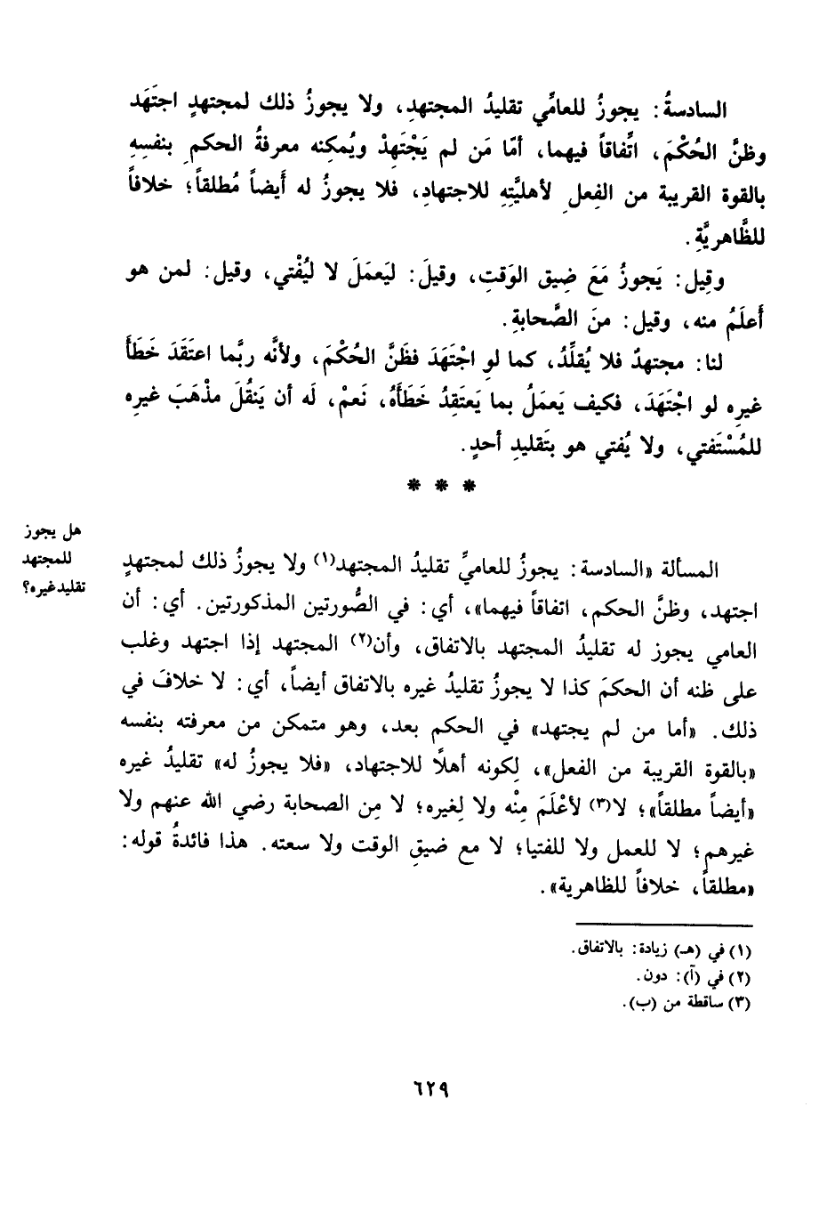 الْمَسْأَلَةُ «السَّادِسَةُ: يَجُوزُ لِلْعَامِّيِّ تَقْلِيدُ الْمُجْتَهِدِ وَلَا يَجُوزُ ذَلِكَ لِمُجْتَهِدٍ اجْتَهَدَ، وَظَنَّ الْحُكْمَ، اتِّفَاقًا فِيهِمَا» ، أَيْ: فِي الصُّورَتَيْنِ الْمَذْكُورَتَيْنِ. أَيْ: أَنَّ الْعَامِّيَّ يَجُوزُ لَهُ تَقْلِيدُ الْمُجْتَهِدِ بِالِاتِّفَاقِ، وَأَنَّ الْمُجْتَهِدَ إِذَا اجْتَهَدَ وَغَلَبَ عَلَى ظَنِّهِ أَنَّ الْحُكْمَ كَذَا لَا يَجُوزُ تَقْلِيدُ غَيْرِهِ بِالِاتِّفَاقِ أَيْضًا، أَيْ: لَا خِلَافَ فِي ذَلِكَ. «أَمَّا مَنْ لَمْ يَجْتَهِدْ» فِي الْحُكْمِ بَعْدُ، وَهُوَ مُتَمَكِّنٌ مِنْ مَعْرِفَتِهِ بِنَفْسِهِ «بِالْقُوَّةِ الْقَرِيبَةِ مِنَ الْفِعْلِ» ، لِكَوْنِهِ أَهْلًا لِلِاجْتِهَادِ، «فَلَا يَجُوزُ لَهُ» تَقْلِيدُ غَيْرِهِ «أَيْضًا مُطْلَقًا» ؛ لَا لِأَعْلَمَ مِنْهُ وَلَا لِغَيْرِهِ؛ لَا مِنَ الصَّحَابَةِ - رَضِيَ اللَّهُ عَنْهُمْ - وَلَا غَيْرِهِمْ؛ لَا لِلْعَمَلِ وَلَا لِلْفُتْيَا؛ لَا مَعَ ضِيقِ الْوَقْتِ وَلَا سَعَتِهِ. هَذَا فَائِدَةُ قَوْلِهِ: «مُطْلَقًا، خِلَافًا لِلظَّاهِرِيَّةِ» .