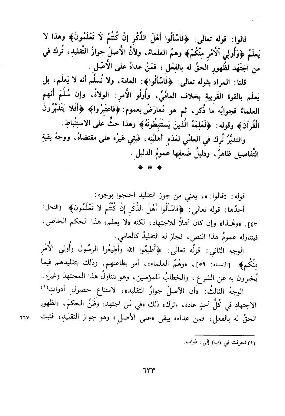 الْوَجْهُ الثَّانِي: قَوْلُهُ تَعَالَى: {وَأَطِيعُوا اللَّهَ وَأَطِيعُوا الرَّسُولَ وَأُولِي الْأَمْرِ مِنْكُمْ} [النِّسَاءِ: 59] ، «وَهُمُ الْعُلَمَاءُ» ، أَمَرَ بِطَاعَتِهِمْ، وَذَلِكَ بِتَقْلِيدِهِمْ فِيمَا يُخْبِرُونَ بِهِ عَنِ الشَّرْعِ، وَالْخِطَابُ لِلْمُؤْمِنِينَ، وَهُوَ يَتَنَاوَلُ هَذَا الْمُجْتَهِدَ وَغَيْرَهُ.