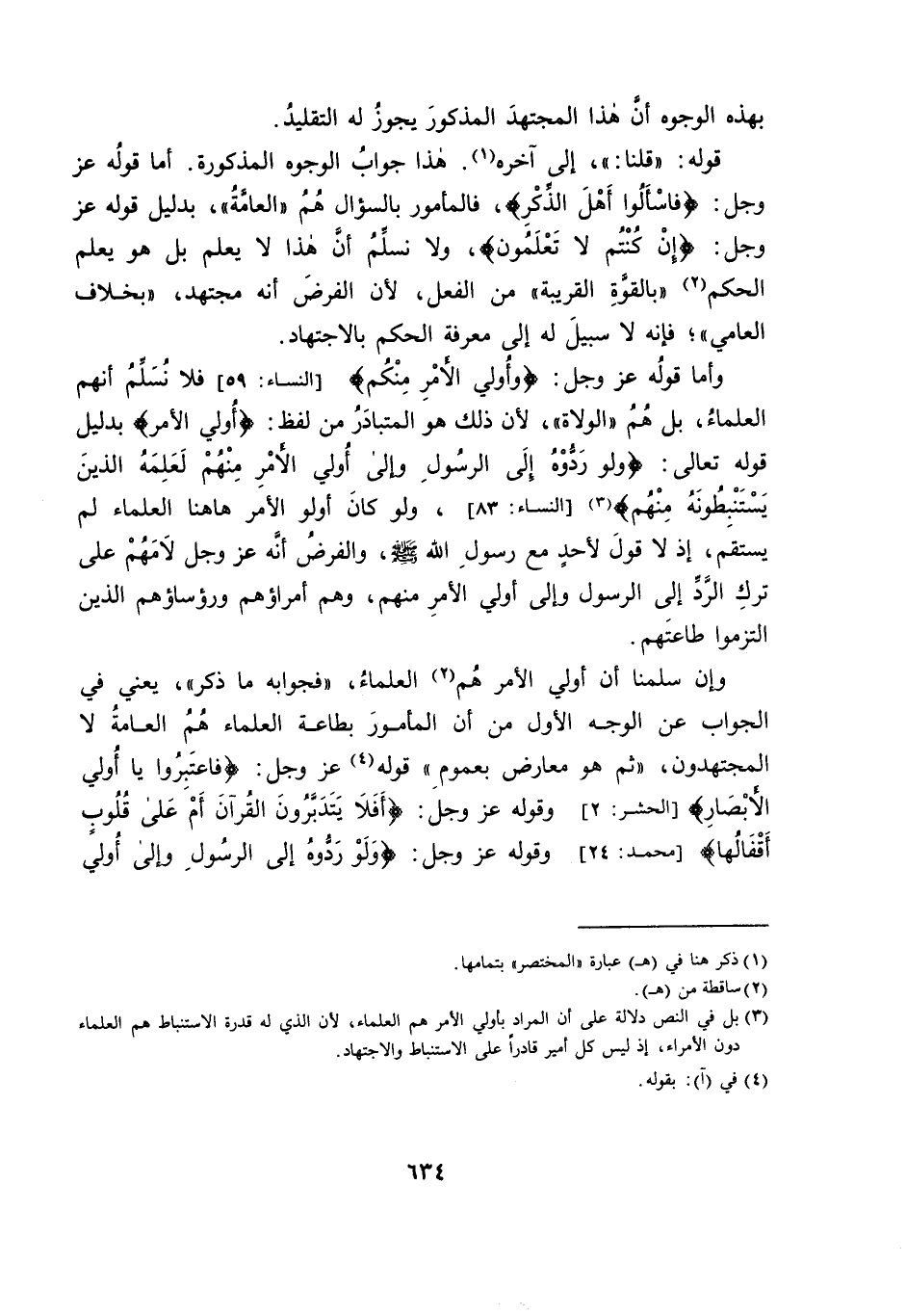وَأَمَّا قَوْلُهُ - عَزَّ وَجَلَّ -: {وَأُولِي الْأَمْرِ مِنْكُمْ} [النِّسَاءِ: 59] فَلَا نُسَلِّمُ أَنَّهُمُ الْعُلَمَاءُ، بَلْ هُمُ «الْوُلَاةُ» ، لِأَنَّ ذَلِكَ هُوَ الْمُتَبَادَرُ مِنْ لَفْظِ: {وَأُولِي الْأَمْرِ} بِدَلِيلِ قَوْلِهِ تَعَالَى: {وَلَوْ رَدُّوهُ إِلَى الرَّسُولِ وَإِلَى أُولِي الْأَمْرِ مِنْهُمْ لَعَلِمَهُ الَّذِينَ يَسْتَنْبِطُونَهُ مِنْهُمْ} [النِّسَاءِ: 83] ، وَلَوْ كَانَ أُولُو الْأَمْرِ هَهُنَا الْعُلَمَاءَ لَمْ يَسْتَقِمْ، إِذْ لَا قَوْلَ لِأَحَدٍ مَعَ رَسُولِ اللَّهِ - صَلَّى اللَّهُ عَلَيْهِ وَسَلَّمَ - وَالْفَرْضُ أَنَّهُ - عَزَّ وَجَلَّ - لَامَهُمْ عَلَى تَرْكِ الرَّدِّ إِلَى الرَّسُولِ وَإِلَى أُولِي الْأَمْرِ مِنْهُمْ، وَهُمْ أُمَرَاؤُهُمْ وَرُؤَسَاؤُهُمُ الَّذِينَ الْتَزَمُوا طَاعَتَهُمْ.