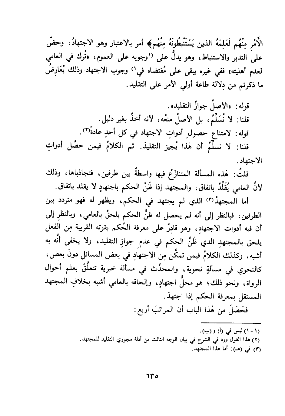 قُلْنَا: لَا نُسَلِّمُ أَنَّ هَذَا يُجِيزُ التَّقْلِيدَ. ثُمَّ الْكَلَامُ فِيمَنْ حَصَّلَ أَدَوَاتِ الِاجْتِهَادِ.