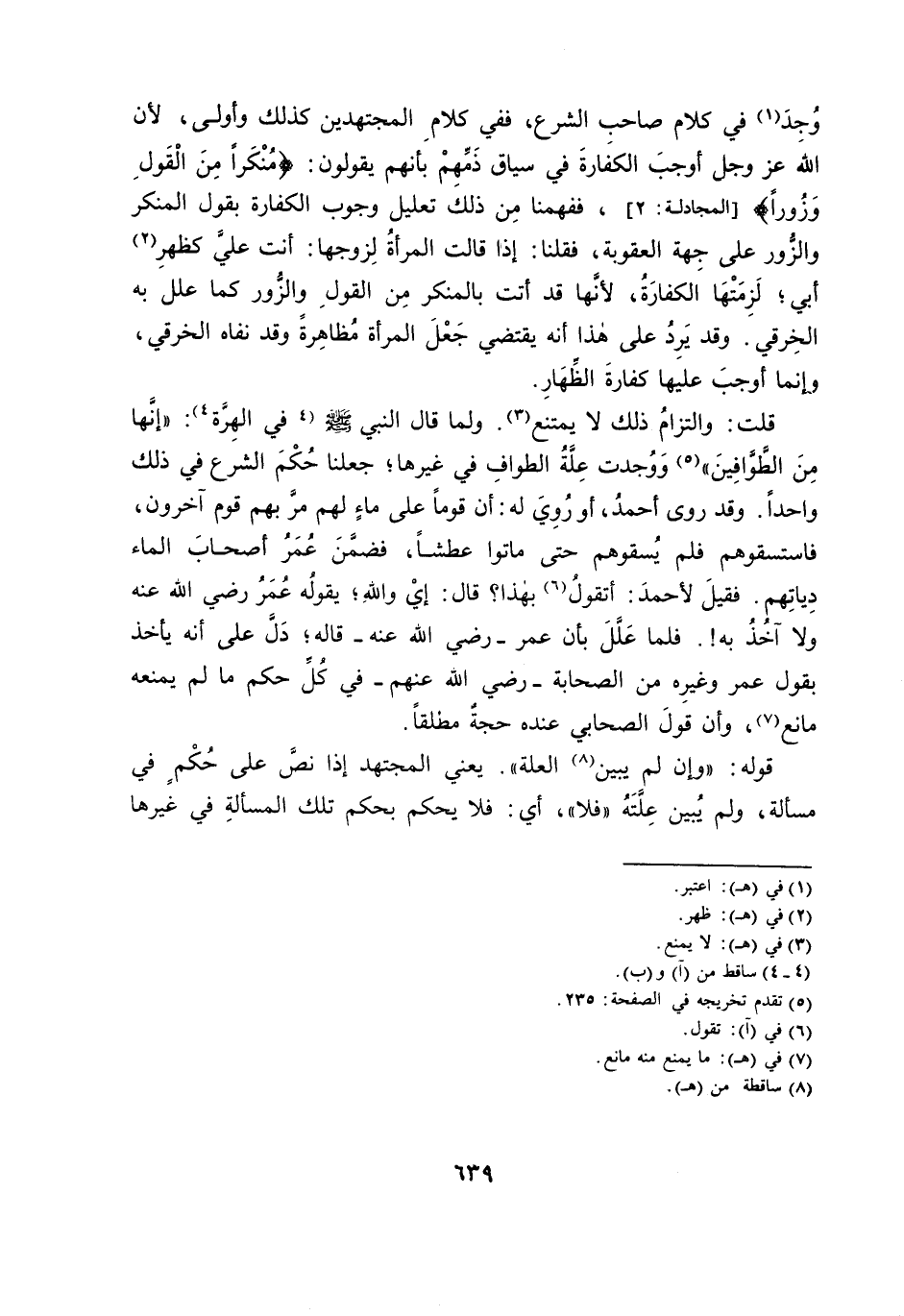 وُجِدَ فِي كَلَامِ صَاحِبِ الشَّرْعِ، فَفِي كَلَامِ الْمُجْتَهِدِينَ كَذَلِكَ وَأَوْلَى، لِأَنَّ اللَّهَ - عَزَّ وَجَلَّ - أَوْجَبَ الْكَفَّارَةَ فِي سِيَاقِ ذَمِّهِمْ بِأَنَّهُمْ يَقُولُونَ: {مُنْكَرًا مِنَ الْقَوْلِ وَزُورًا} [الْمُجَادَلَةِ: 2] ، فَفَهِمْنَا مِنْ ذَلِكَ تَعْلِيلَ وُجُوبِ الْكَفَّارَةِ بِقَوْلِ الْمُنْكَرِ وَالزُّورِ عَلَى جِهَةِ الْعُقُوبَةِ، فَقُلْنَا: إِذَا قَالَتِ الْمَرْأَةُ لِزَوْجِهَا: أَنْتَ عَلَيَّ كَظَهْرِ أَبِي؛ لَزِمَتْهَا الْكَفَّارَةُ، لِأَنَّهَا قَدْ أَتَتْ بِالْمُنْكَرِ مِنَ الْقَوْلِ وَالزُّورِ كَمَا عَلَّلَ بِهِ الْخِرَقِيُّ. وَقَدْ يَرِدُ عَلَى هَذَا أَنَّهُ يَقْتَضِي جَعْلَ الْمَرْأَةِ مُظَاهِرَةً وَقَدْ نَفَاهُ الْخِرَقِيُّ، وَإِنَّمَا أَوْجَبَ عَلَيْهَا كَفَّارَةَ الظِّهَارِ.