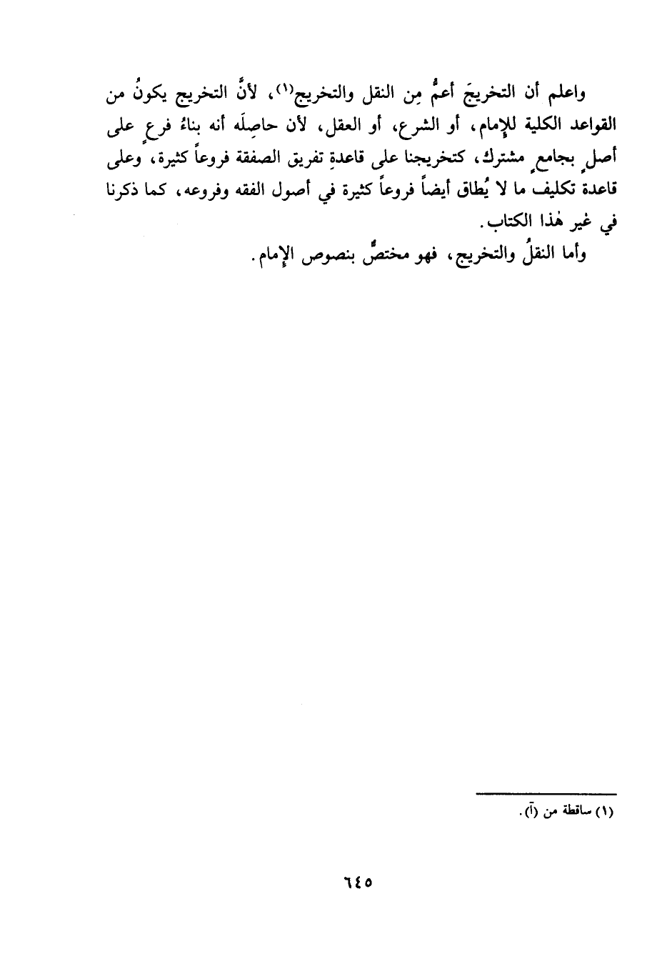 وَاعْلَمْ أَنَّ التَّخْرِيجَ أَعَمُّ مِنَ النَّقْلِ وَالتَّخْرِيجِ، لِأَنَّ التَّخْرِيجَ يَكُونُ مِنَ الْقَوَاعِدِ الْكُلِّيَّةِ لِلْإِمَامِ، أَوِ الشَّرْعِ، أَوِ الْعَقْلِ، لِأَنَّ حَاصِلَهُ أَنَّهُ بِنَاءُ فَرْعٍ عَلَى أَصْلٍ بِجَامِعٍ مُشْتَرَكٍ، كَتَخْرِيجِنَا عَلَى قَاعِدَةِ تَفْرِيقِ الصَّفْقَةِ فُرُوعًا كَثِيرَةً، وَعَلَى قَاعِدَةِ تَكْلِيفِ مَا لَا يُطَاقُ أَيْضًا فُرُوعًا كَثِيرَةً فِي أُصُولِ الْفِقْهِ وَفُرُوعِهِ، كَمَا ذَكَرْنَا فِي غَيْرِ هَذَا الْكِتَابِ.