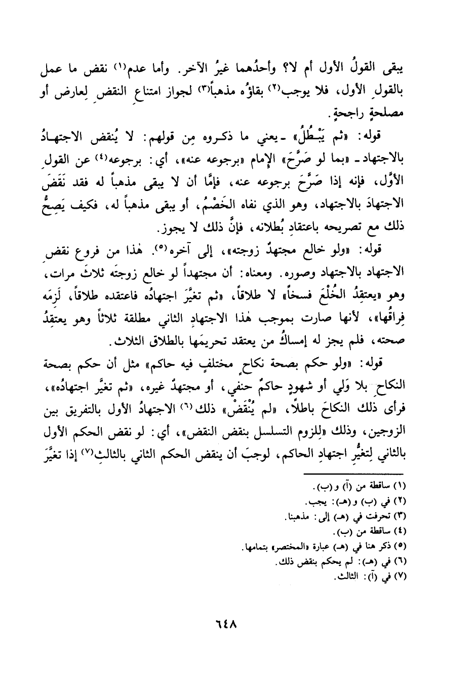 قَوْلُهُ: «ثُمَّ يَبْطُلُ» - يَعْنِي مَا ذَكَرُوهُ مِنْ قَوْلِهِمْ: لَا يُنْقَضُ الِاجْتِهَادُ بِالِاجْتِهَادِ - «بِمَا لَوْ صَرَّحَ» الْإِمَامُ «بِرُجُوعِهِ عَنْهُ» ، أَيْ: بِرُجُوعِهِ عَنِ الْقَوْلِ الْأَوَّلِ، فَإِنَّهُ إِذَا صَرَّحَ بِرُجُوعِهِ عَنْهُ، فَإِمَّا أَنْ لَا يَبْقَى مَذْهَبًا لَهُ فَقَدْ نَقَضَ الِاجْتِهَادَ بِالِاجْتِهَادِ، وَهُوَ الَّذِي نَفَاهُ الْخَصْمُ، أَوْ يَبْقَى مَذْهَبًا لَهُ، فَكَيْفَ يَصِحُّ ذَلِكَ مَعَ تَصْرِيحِهِ بِاعْتِقَادِ بُطْلَانِهِ، فَإِنَّ ذَلِكَ لَا يَجُوزُ.