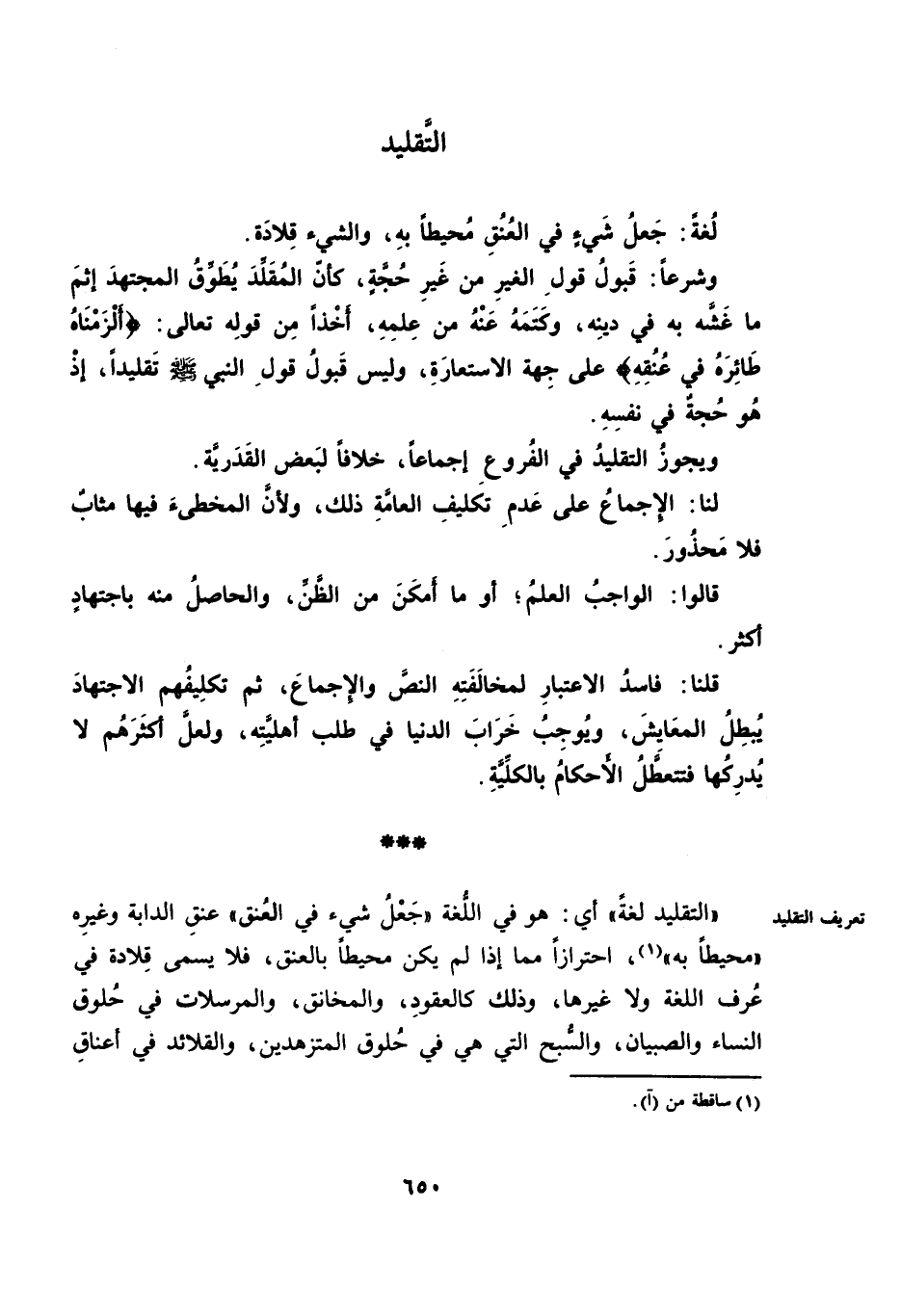 وَشَرْعًا: قَبُولُ قَوْلِ الْغَيْرِ مِنْ غَيْرِ حُجَّةٍ، كَأَنَّ الْمُقَلِّدَ يُطَوِّقُ الْمُجْتَهِدَ إِثْمَ مَا غَشَّهُ بِهِ فِي دِينِهِ، وَكَتَمَهُ عَنْهُ مِنْ عِلْمِهِ أَخْذًا مِنْ قَوْلِهِ تَعَالَى: {أَلْزَمْنَاهُ طَائِرَهُ فِي عُنُقِهِ} عَلَى جِهَةِ الِاسْتِعَارَةِ، وَلَيْسَ قَبُولُ قَوْلِ النَّبِيِّ - صَلَّى اللَّهُ عَلَيْهِ وَسَلَّمَ - تَقْلِيدًا، إِذْ هُوَ حُجَّةٌ فِي نَفْسِهِ.