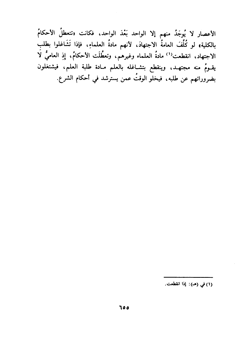 الْأَعْصَارِ لَا يُوجَدُ مِنْهُمْ إِلَّا الْوَاحِدُ بَعْدَ الْوَاحِدِ، فَكَانَتْ «تَتَعَطَّلُ الْأَحْكَامُ بِالْكُلِّيَّةِ» لَوْ كُلِّفَ الْعَامَّةُ الِاجْتِهَادَ، لِأَنَّهُمْ مَادَّةُ الْعُلَمَاءِ، فَإِذَا تَشَاغَلُوا بِطَلَبِ الِاجْتِهَادِ، انْقَطَعَتْ مَادَّةُ الْعُلَمَاءِ وَغَيْرِهِمْ، وَتَعَطَّلَتِ الْأَحْكَامُ، إِذِ الْعَامِّيُّ لَا يَقُومُ مِنْهُ مُجْتَهِدٌ، وَيَنْقَطِعُ بِتَشَاغُلِهِ بِالْعِلْمِ مَادَّةَ طَلَبِهِ الْعِلْمَ، فَيَشْتَغِلُونَ بِضَرُورَاتِهِمْ عَنْ طَلَبِهِ، فَيَخْلُو الْوَقْتُ عَمَّنْ يَسْتَرْشِدُ فِي أَحْكَامِ الشَّرْعِ.