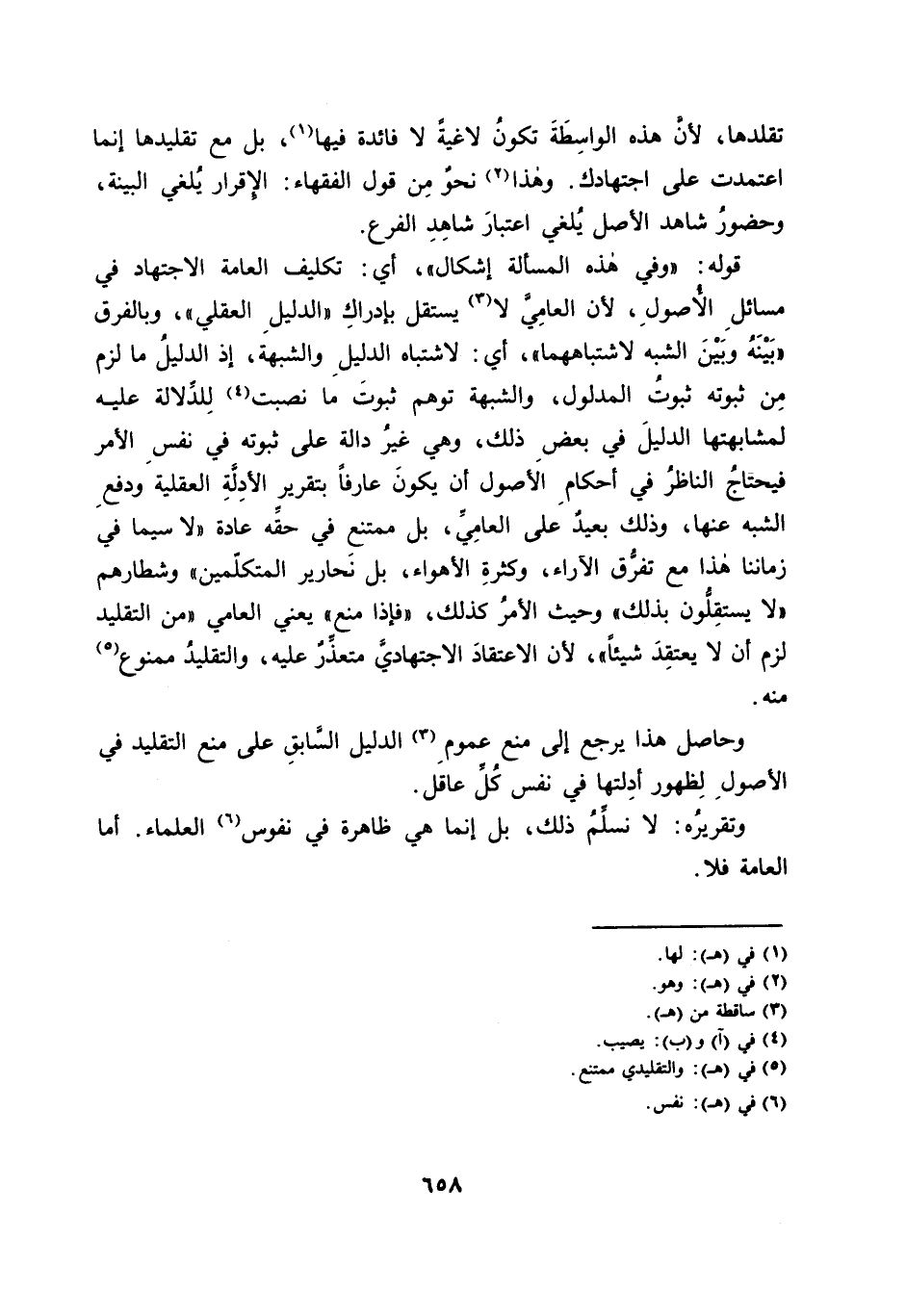 قَوْلُهُ: «وَفِيِ هَذِهِ الْمَسْأَلَةِ إِشْكَالٌ» ، أَيْ: تَكْلِيفُ الْعَامَّةِ الِاجْتِهَادَ فِي مَسَائِلِ الْأُصُولِ، لِأَنَّ الْعَامِّيَّ لَا يَسْتَقِلُّ بِإِدْرَاكِ «الدَّلِيلِ الْعَقْلِيِّ» ، وَبِالْفَرْقِ «بَيْنَهُ وَبَيْنَ الشُّبَهِ لِاشْتِبَاهِهِمَا» ، أَيْ: لِاشْتِبَاهِ الدَّلِيلِ وَالشُّبْهَةِ، إِذِ الدَّلِيلُ مَا لَزِمَ مِنْ ثُبُوتِهِ ثُبُوتُ الْمَدْلُولِ، وَالشُّبْهَةُ تُوهِمُ ثُبُوتَ مَا نُصِبَتْ لِلدَّلَالَةِ عَلَيْهِ لِمُشَابَهَتِهَا الدَّلِيلَ فِي بَعْضِ ذَلِكَ، وَهِيَ غَيْرُ دَالَّةٍ عَلَى ثُبُوتِهِ فِي نَفْسِ الْأَمْرِ فَيَحْتَاجُ النَّاظِرُ فِي أَحْكَامِ الْأُصُولِ أَنْ يَكُونَ عَارِفًا بِتَقْرِيرِ الْأَدِلَّةِ الْعَقْلِيَّةِ وَدَفْعِ الشُّبَهِ عَنْهَا، وَذَلِكَ بَعِيدٌ عَنِ الْعَامِّيِّ، بَلْ مُمْتَنِعٌ فِي حَقِّهِ عَادَةً «لَا سِيَّمَا فِي زَمَانِنَا هَذَا مَعَ تَفَرُّقِ الْآرَاءِ، وَكَثْرَةِ الْأَهْوَاءِ، بَلْ نَحَارِيرُ الْمُتَكَلِّمِينَ» وَشُطَّارُهُمْ «لَا يَسْتَقِلُّونَ بِذَلِكَ» وَحَيْثُ الْأَمْرُ كَذَلِكَ، «فَإِذَا مُنِعَ» يَعْنِي الْعَامِّيَّ «مِنَ التَّقْلِيدِ لَزِمَ أَنْ لَا يَعْتَقِدَ شَيْئًا» ، لِأَنَّ الِاعْتِقَادَ الِاجْتِهَادِيَّ مُتَعَذِّرٌ عَلَيْهِ، وَالتَّقْلِيدُ مَمْنُوعٌ مِنْهُ.