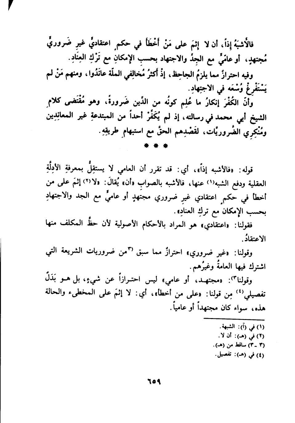 وَقَوْلُهُ: «فَالْأَشْبَهُ إِذًا» ، أَيْ: قَدْ تَقَرَّرَ أَنَّ الْعَامِّيَّ لَا يَسْتَقِلُّ بِمَعْرِفَةِ الْأَدِلَّةِ الْعَقْلِيَّةِ وَدَفْعِ الشُّبَهِ عَنْهَا، فَالْأَشْبَهُ بِالصَّوَابِ «أَنْ» يُقَالَ: «لَا إِثْمَ عَلَى مَنْ أَخْطَأَ فِي حُكْمٍ اعْتِقَادِيٍّ غَيْرِ ضَرُورِيٍّ مُجْتَهِدٍ أَوْ عَامِّيٍّ مَعَ الْجِدِّ وَالِاجْتِهَادِ بِحَسَبِ الْإِمْكَانِ مَعَ تَرْكِ الْعِنَادِ» .