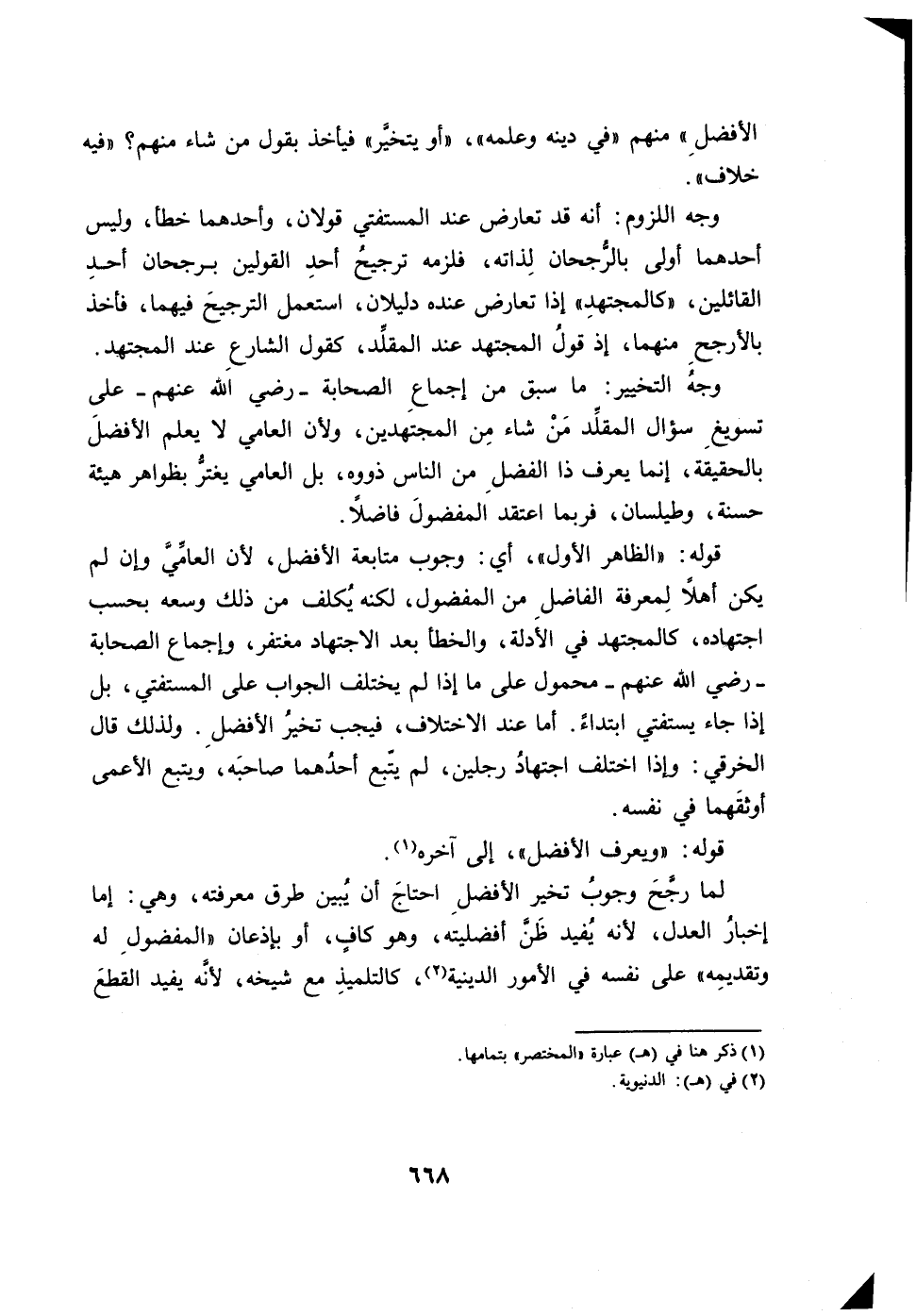 الْأَفْضَلِ» مِنْهُمْ «فِي دِينِهِ وَعِلْمِهِ» ، «أَوْ يَتَخَيَّرُ» فَيَأْخُذُ بِقَوْلِ مَنْ شَاءَ مِنْهُمْ؟ «فِيهِ خِلَافٌ» .