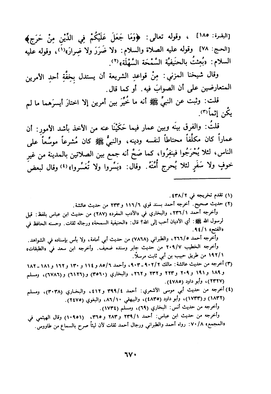 [الْبَقَرَةِ: 185] ، وَقَوْلِهِ تَعَالَى: {وَمَا جَعَلَ عَلَيْكُمْ فِي الدِّينِ مِنْ حَرَجٍ} [الْحَجِّ: 78] ، وَقَوْلُهُ - عَلَيْهِ الصَّلَاةُ وَالسَّلَامُ -: لَا ضَرَرَ وَلَا ضِرَارَ، وَقَوْلَهُ - عَلَيْهِ السَّلَامُ -: بُعِثْتُ بِالْحَنِيفِيَّةِ السَّمْحَةِ السَّهْلَةِ.