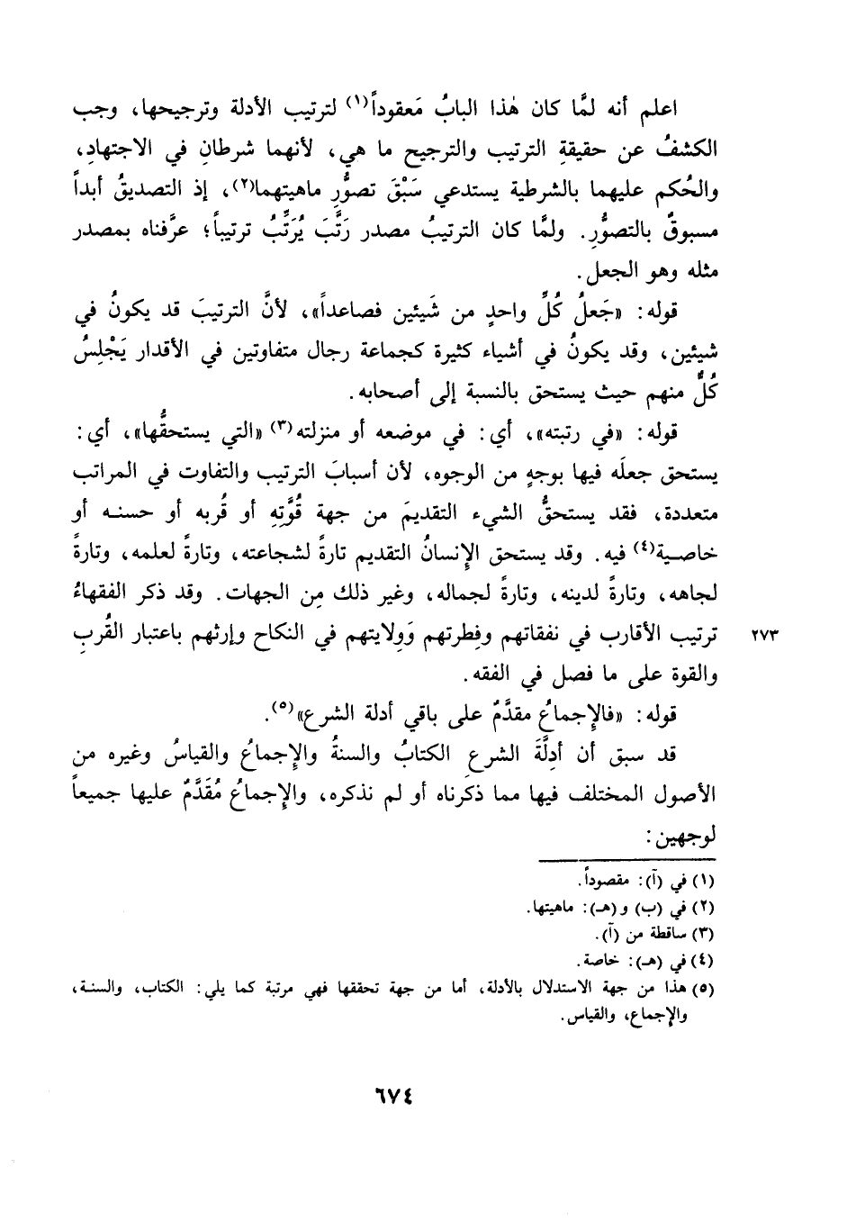 اعْلَمْ أَنَّهُ لَمَّا كَانَ هَذَا الْبَابُ مَعْقُودًا لِتَرْتِيبِ الْأَدِلَّةِ وَتَرْجِيحِهَا، وَجَبَ الْكَشْفُ عَنْ حَقِيقَةِ التَّرْتِيبِ وَالتَّرْجِيحِ مَا هِيَ، لِأَنَّهُمَا شَرْطَانِ فِي الِاجْتِهَادِ، وَالْحُكْمِ عَلَيْهِمَا بِالشَّرْطِيَّةِ يَسْتَدْعِي سَبْقَ تَصَوُّرِ مَاهِيَّتِهِمَا، إِذِ التَّصْدِيقُ أَبَدًا مَسْبُوقٌ بِالتَّصَوُّرِ. وَلَمَّا كَانَ التَّرْتِيبُ مَصْدَرَ رَتَّبَ يُرَتِّبُ تَرْتِيبًا ; عَرَّفْنَاهُ بِمَصْدَرٍ مِثْلِهِ وَهُوَ الْجَعْلُ.