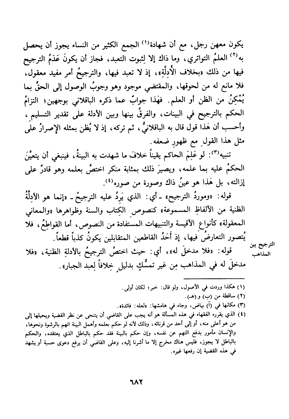 يَكُونَ مَعَهُنَّ رَجُلٌ، مَعَ أَنَّ شَهَادَةَ الْجَمْعِ الْكَثِيرِ مِنَ النِّسَاءِ يَجُوزُ أَنْ يَحْصُلَ بِهِ الْعِلْمُ التَّوَاتُرِيُّ، وَمَا ذَاكَ إِلَّا لِثُبُوتِ التَّعَبُّدِ، فَجَازَ أَنْ يَكُونَ عَدَمُ التَّرْجِيحِ فِيهَا مِنْ ذَلِكَ «بِخِلَافِ الْأَدِلَّةِ» ، إِذْ لَا تَعَبُّدَ فِيهَا، وَالتَّرْجِيحُ أَمْرٌ مُفِيدٌ مَعْقُولٌ، فَلَا مَانِعَ لَهُ مِنْ لُحُوقِهَا، وَالْمُقْتَضِي مَوْجُودٌ وَهُوَ وُجُوبُ الْوُصُولِ إِلَى الْحَقِّ بِمَا يُمْكِنُ مِنَ الظَّنِّ أَوِ الْعِلْمِ. فَهَذَا جَوَابٌ عَمَّا ذَكَرَهُ الْبَاقِلَّانِيُّ بِوَجْهَيْنِ ; الْتِزَامُ الْحُكْمِ بِالتَّرْجِيحِ فِي الْبَيِّنَاتِ، وَالْفَرْقُ بَيْنَهَا وَبَيْنَ الْأَدِلَّةِ عَلَى تَقْدِيرِ التَّسْلِيمِ، وَأَحْسَبُ أَنَّ هَذَا قَوْلٌ قَالَ بِهِ الْبَاقِلَّانِيُّ، ثُمَّ تَرَكَهُ، إِذْ لَا يُظَنُّ بِمِثْلِهِ الْإِصْرَارُ عَلَى مَثَلِ هَذَا الْقَوْلِ مَعَ ظُهُورِ ضَعْفِهِ.