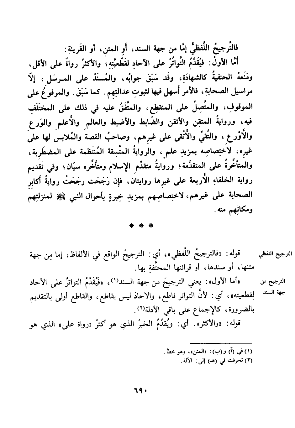 قَوْلُهُ: «فَالتَّرْجِيحُ اللَّفْظِيُّ» ، أَيْ: التَّرْجِيحُ الْوَاقِعُ فِي الْأَلْفَاظِ، إِمَّا مِنْ جِهَةِ مَتْنِهَا، أَوْ سَنَدِهَا، أَوْ قَرَائِنِهَا الْمُحْتَفَّةِ بِهَا.
