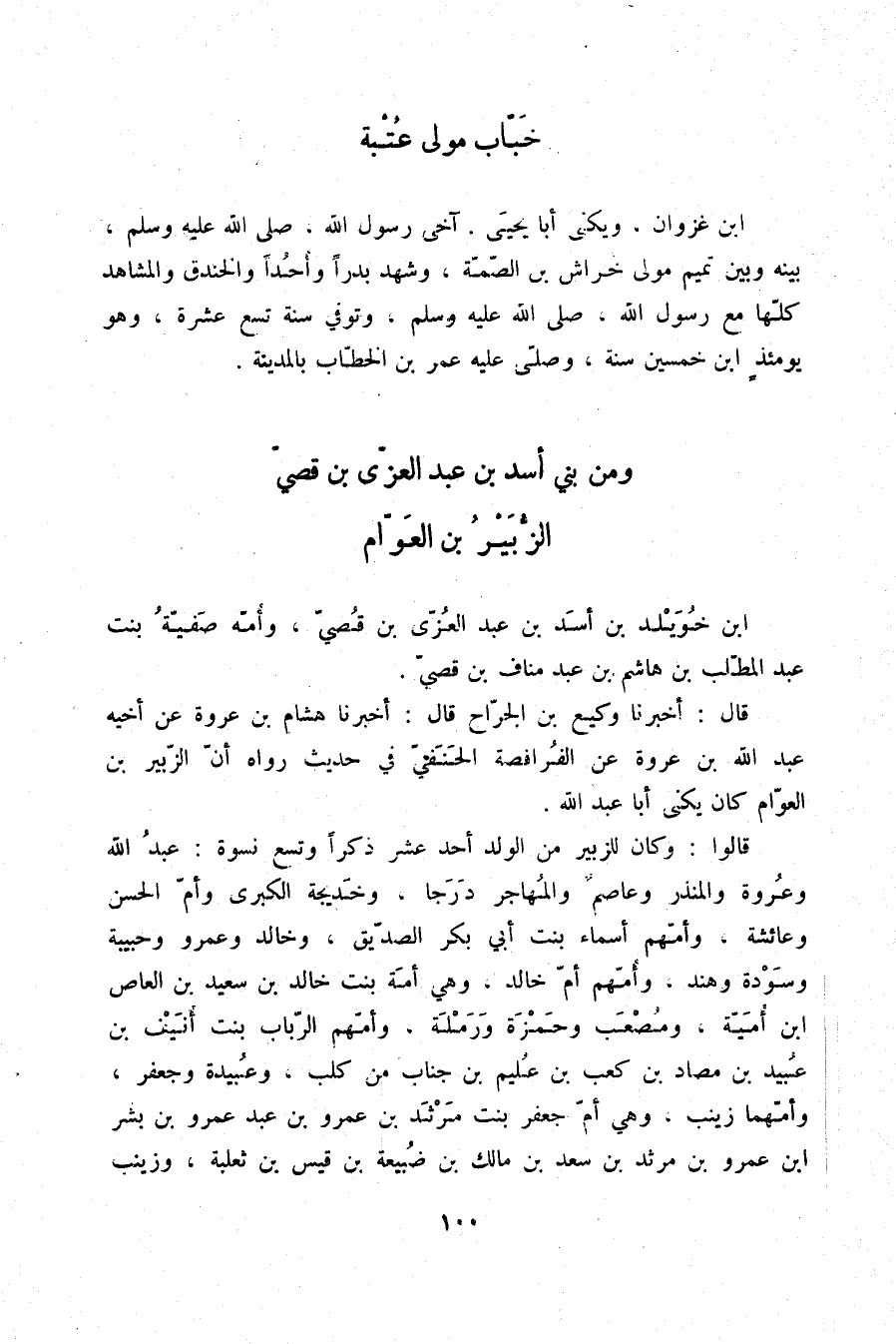 §الزُّبَيْرُ بْنُ الْعَوَّامِ بْنِ خُوَيْلِدِ بْنِ أَسَدِ بْنِ عَبْدِ الْعُزَّى بْنِ قُصَيٍّ وَأُمُّهُ صَفِيَّةُ بِنْتُ عَبْدِ الْمُطَّلِبِ بْنِ هَاشِمِ بْنِ عَبْدِ مَنَافِ بْنِ قُصَيٍّ