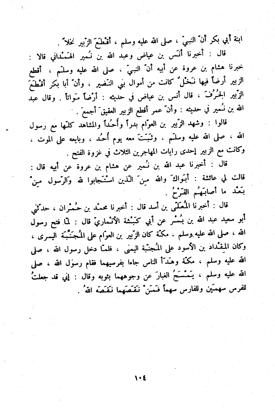 قَالَ: أَخْبَرَنَا أَنَسُ بْنُ عِيَاضٍ، وَعَبْدُ اللَّهِ بْنُ نُمَيْرٍ الْهَمْدَانِيُّ، قَالَا: أَخْبَرَنَا هِشَامُ بْنُ عُرْوَةَ، عَنْ أَبِيهِ: «§أَنَّ النَّبِيَّ صلّى الله عليه وسلم أَقْطَعَ الزُّبَيْرَ أَرْضًا فِيهَا نَخْلٌ كَانَتْ مِنْ أَمْوَالِ بَنِي النَّضِيرِ، وَأَنَّ أَبَا بَكْرٍ أَقْطَعَ الزُّبَيْرَ الْجُرُفَ» . قَالَ أَنَسُ بْنُ عِيَاضٍ فِي حَدِيثِهِ: أَرْضًا مَوَاتًا، وَقَالَ عَبْدُ اللَّهِ بْنُ نُمَيْرٍ فِي حَدِيثِهِ: وَأَنَّ عُمَرَ أَقْطَعَ الزُّبَيْرَ الْعَقِيقَ أَجْمَعَ " قَالُوا: وَشَهِدَ الزُّبَيْرُ بْنُ الْعَوَّامِ بَدْرًا، وأُحُدًا وَالْمَشَاهِدَ كُلَّهَا مَعَ رَسُولِ اللَّهِ صلّى الله عليه وسلم، وَثَبَتَ مَعَهُ يَوْمَ أُحُدٍ وَبَايَعَهُ عَلَى الْمَوْتِ، وَكَانَتْ مَعَ الزُّبَيْرِ إِحْدَى رَايَاتِ الْمُهَاجِرِينَ الثَّلَاثِ فِي غَزْوَةِ الْفَتْحِ