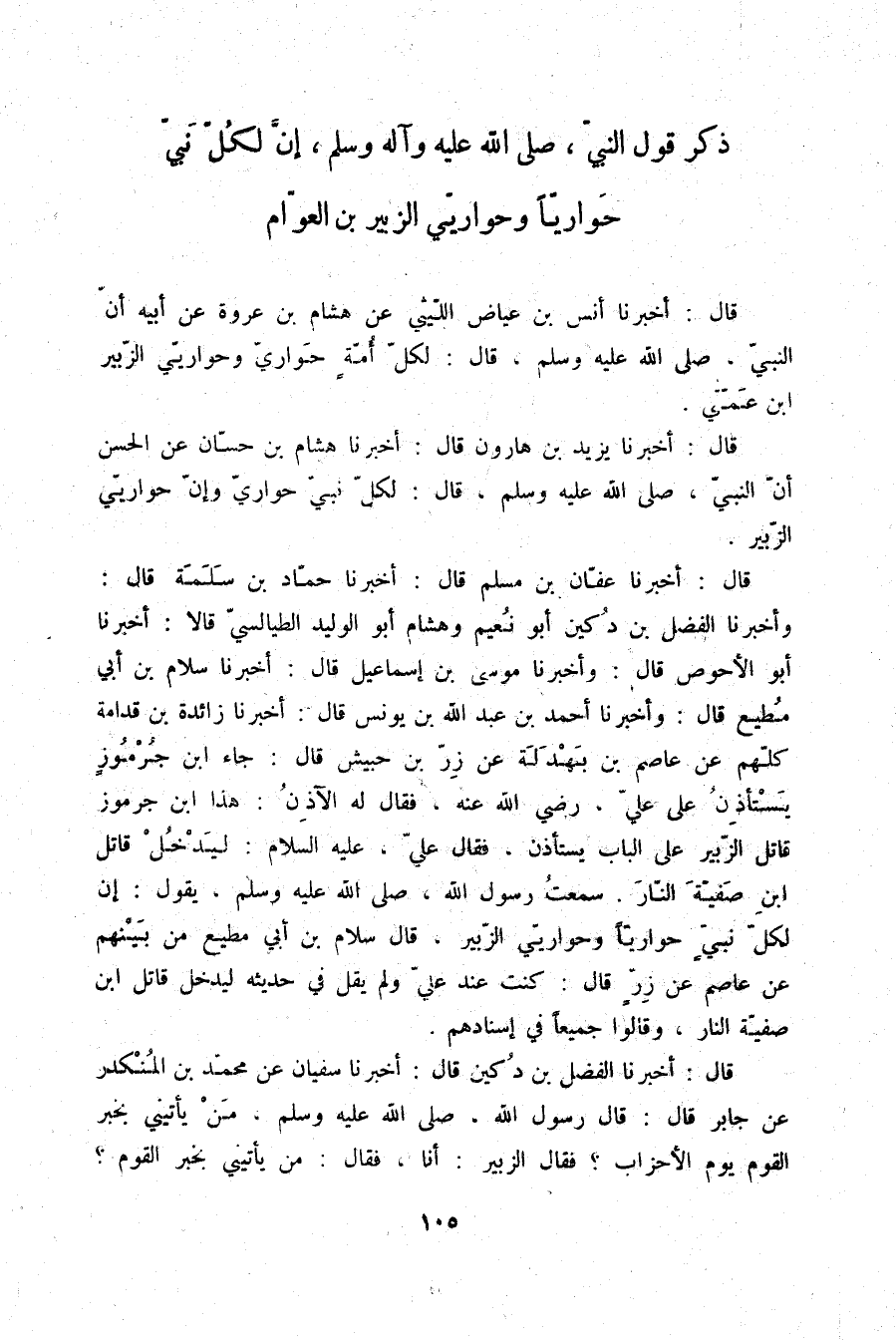 قَالَ: أَخْبَرَنَا عَفَّانُ بْنُ مُسْلِمٍ قَالَ: أَخْبَرَنَا حَمَّادُ بْنُ سَلَمَةَ قَالَ: وَأَخْبَرَنَا الْفَضْلُ بْنُ دُكَيْنٍ أَبُو نُعَيْمٍ، وَهِشَامُ أَبُو الْوَلِيدِ الطَّيَالِسِيُّ، قَالَا: أَخْبَرَنَا أَبُو الْأَحْوَصِ قَالَ: وَأَخْبَرَنَا مُوسَى بْنُ إِسْمَاعِيلَ قَالَ: أَخْبَرَنَا سَلَّامُ بْنُ أَبِي مُطِيعٍ قَالَ: وَأَخْبَرَنَا أَحْمَدُ بْنُ عَبْدِ اللَّهِ بْنِ يُونُسَ قَالَ: أَخْبَرَنَا زَائِدَةُ بْنُ قُدَامَةَ، كُلُّهُمْ عَنْ عَاصِمِ ابْنِ بَهْدَلَةَ، عَنْ زِرِّ بْنِ حُبَيْشٍ: جَاء ابْنُ جُرْمُوزٍ يَسْتَأْذِنُ عَلَى عَلِيٍّ رَضِيَ اللَّهُ عَنْهُ فَقَالَ لَهُ الْآذِنُ: هَذَا ابْنُ جُرْمُوزٍ قَاتِلُ الزُّبَيْرِ عَلَى الْبَابِ يَسْتَأْذِنُ، فَقَالَ عَلِيٌّ عَلَيْهِ السَّلَامُ: لِيَدْخُلْ قَاتَلُ ابْنِ صَفِيَّةَ النَّارَ، سَمِعْتُ رَسُولَ اللَّهِ صلّى الله عليه وسلم يَقُولُ: «§إِنَّ لِكُلِّ نَبِيٍّ حَوَارِيًّا، وَحَوَاريِيَّ الزُّبَيْرُ» . قَالَ سَلَّامُ بْنُ أَبِي مُطِيعٍ مِنْ بَيْنِهِمْ عَنْ عَاصِمٍ، عَنْ زِرٍّ، قَالَ: كُنْتُ عِنْدَ عَلِيٍّ وَلَمْ يَقُلْ فِي حَدِيثِهِ: «لِيَدْخُلْ قَاتَلُ ابْنَ صَفِيَّةَ النَّارِ» ، وَقَالُوا جَمِيعًا فِي إِسْنَادِهِمْ.