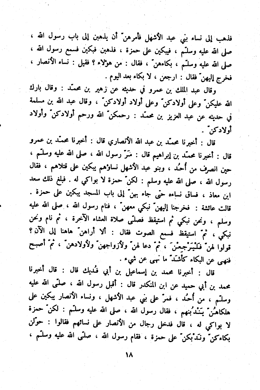 قَالَ: أَخْبَرَنَا مُحَمَّدُ بْنُ عَبْدِ اللَّهِ الْأَنْصَارِيُّ، قَالَ: أَخْبَرَنَا مُحَمَّدُ بْنُ عَمْرٍو، قَالَ: أَخْبَرَنَا مُحَمَّدُ بْنُ إِبْرَاهِيمَ، قَالَ: " مَرَّ رَسُولُ اللَّهِ صلّى الله عليه وسلم، حِينَ انْصَرَفَ مِنْ أُحُدٍ، وَبَنُو عَبْدِ الْأَشْهَلِ نِسَاؤُهُمْ يَبْكِينَ عَلَى قَتْلَاهُمْ، فَقَالَ رَسُولُ اللَّهِ صلّى الله عليه وسلم: «§لَكِنَّ حَمْزَةَ لَا بَوَاكِيَ لَهُ» ، فَبَلَغَ ذَلِكَ سَعْدَ بْنَ مُعَاذٍ فَسَاقَ نِسَاءَهُ حَتَّى جَاءَ بِهِنَّ إِلَى بَابِ الْمَسْجِدِ يَبْكِينَ عَلَى حَمْزَةَ، قَالَتْ عَائِشَةُ فَخَرَجْنَا إِلَيْهِنَّ نَبْكِي مَعَهُنَّ، فَنَامَ رَسُولُ اللَّهِ صلّى الله عليه وسلم وَنَحْنُ نَبْكِي، ثُمَّ اسْتَيْقَظَ فَصَلَّى صَلَاةَ الْعِشَاءِ الْآخِرَةِ، ثُمَّ نَامَ وَنَحْنُ نَبْكِي، ثُمَّ اسْتَيْقَظَ فَسَمِعَ الصَّوْتَ، فَقَالَ: «أَلَا أَرَاهُنَّ هَاهُنَا إِلَى الْآنَ، قُولُوا لَهُنَّ فَلْيَرْجِعْنَ» ، ثُمَّ دَعَا لَهُنَّ وَلِأَزْوَاجِهِنَّ وَلِأَوْلَادِهِنَّ، ثُمَّ أَصْبَحَ فَنَهَى عَنِ الْبُكَاءِ كَأَشَدِّ مَا نَهَى عَنْ شَيْءٍ "