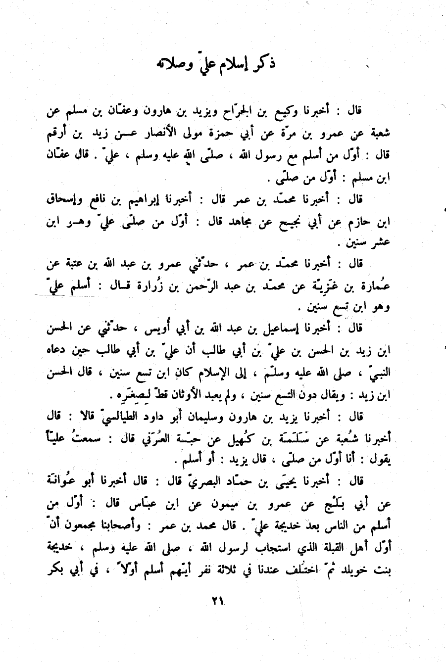 قَالَ: أَخْبَرَنَا يَحْيَى بْنُ حَمَّادٍ الْبَصْرِيُّ، قَالَ: قَالَ: أَخْبَرَنَا أَبُو عَوَانَةَ، عَنْ أَبِي بَلْجٍ، عَنْ عَمْرِو بْنِ مَيْمُونٍ، عَنِ ابْنِ عَبَّاسٍ قَالَ: «§أَوَّلُ مَنْ أَسْلَمَ مِنَ النَّاسِ بَعْدَ خَدِيجَةَ عَلِيٌّ» قَالَ مُحَمَّدُ بْنُ عُمَرَ: وَأَصْحَابُنَا مُجْمِعُونَ أَنَّ أَوَّلَ أَهْلِ الْقِبْلَةِ الَّذِي اسْتَجَابَ لِرَسُولِ اللَّهِ صلّى الله عليه وسلم: خَدِيجَةُ بِنْتُ خُوَيْلِدٍ، ثُمَّ اخْتُلِفَ عِنْدَنَا فِي ثَلَاثَةِ نَفَرٍ أَيُّهُمْ أَسْلَمَ أَوَّلًا، فِي أَبِي بَكْرٍ -[22]-، وَعَلِيٍّ، وَزَيْدِ بْنِ حَارِثَةَ، وَمَا نَجْدُ إِسْلَامَ عَلِيٍّ صَحِيحًا إِلَّا وَهُوَ ابْنُ إِحْدَى عَشْرَةَ سَنَةً "