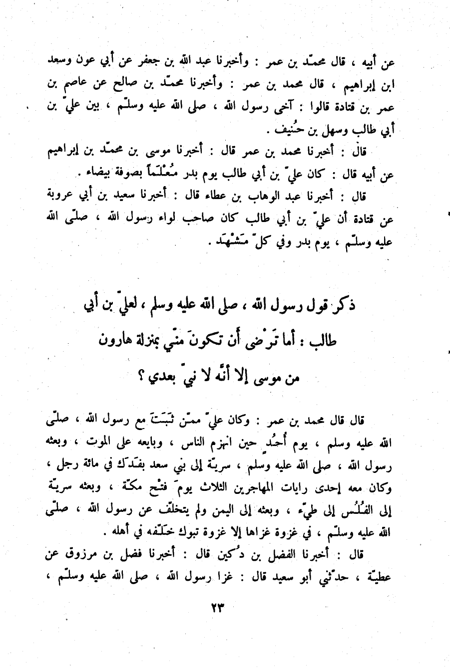 §ذِكْرُ قَوْلِ رَسُولِ اللَّهِ صَلَّى الْلَّهُ عَلَيْهِ وَسَلَّمَ لِعَلِيِّ بْنِ أَبِي طَالِبٍ: «أَمَا تَرْضَى أَنْ تَكُونَ مِنِّي بِمَنْزِلَةِ هَارُونَ مِنْ مُوسَى إِلَّا أَنَّهُ لَا نَبِيَّ بَعْدِي» قَالَ: قَالَ مُحَمَّدُ بْنُ عُمَرَ: وَكَانَ عَلِيٌّ مِمَّنْ ثَبَتَ مَعَ رَسُولِ اللَّهِ صلّى الله عليه وسلم يَوْمَ أُحُدٍ حِينَ انْهَزَمَ النَّاسُ وَبَايَعَهُ عَلَى الْمَوْتِ، وَبَعْثَهُ رَسُولُ اللَّهِ صلّى الله عليه وسلم سَرِيَّةً إِلَى بَنِي سَعْدٍ بِفَدَكَ فِي مِائَةِ رَجُلٍ، وَكَانَ مَعَهُ إِحْدَى رَايَاتِ الْمُهَاجِرِينَ الثَّلَاثِ يَوْمَ فَتْحِ مَكَّةَ وَبَعْثَهُ سَرِيَّةً إِلَى الْفُلُسِ إِلَى طَيِّئٍ، وَبَعْثَهُ إِلَى الْيَمَنِ وَلَمْ يَتَخَلَّفْ عَنْ رَسُولِ اللَّهِ صلّى الله عليه وسلم فِي غَزْوَةٍ غَزَاهَا إِلَّا غَزْوَةَ تَبُوكَ، خَلَّفَهُ فِي أَهْلِهِ.