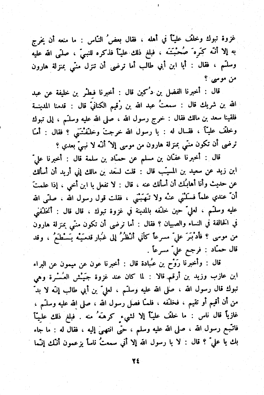 قَالَ: أَخْبَرَنَا عَفَّانُ بْنُ مُسْلِمٍ، عَنْ حَمَّادِ بْنِ سَلَمَةَ قَالَ: أَخْبَرَنَا عَلِيُّ بْنُ زَيْدٍ، عَنْ سَعِيدِ بْنِ الْمُسَيِّبِ قَالَ: قُلْتُ لِسَعْدِ بْنِ مَالِكٍ: إِنِّي أُرِيدُ أَنْ أَسْأَلَكَ عَنْ حَدِيثٍ وَأَنَا أَهَابُكَ أَنْ أَسْأَلَكَ عَنْهُ، قَالَ: لَا تَفْعَلْ يَا ابْنَ أَخِي، إِذَا عَلِمْتَ أَنَّ عِنْدِيَ عِلْمًا فَسَلْنِي عَنْهُ وَلَا تَهَبْنِي، فَقُلْتُ: قَوْلُ رَسُولِ اللَّهِ صلّى الله عليه وسلم لِعَلِيٍّ حِينَ خَلَّفَهُ بِالْمَدِينَةِ فِي غَزْوَةِ تَبُوكَ قَالَ: قَالَ: أَتُخَلِّفُنِي فِي الْخَالِفَةِ فِي النِّسَاءِ وَالصِّبْيَانِ، فَقَالَ: «§أَمَا تَرْضَى أَنْ تَكُونَ مِنِّي بِمَنْزِلَةِ هَارُونَ مِنْ مُوسَى» . فَأَدْبَرَ عَلِيٌّ مُسْرِعًا كَأَنِّي أَنْظُرُ إِلَى غُبَارِ قَدَمَيْهِ يَسْطَعُ "، وَقَدْ قَالَ حَمَّادٌ: «فَرَجَعَ عَلِيٌّ مُسْرِعًا»