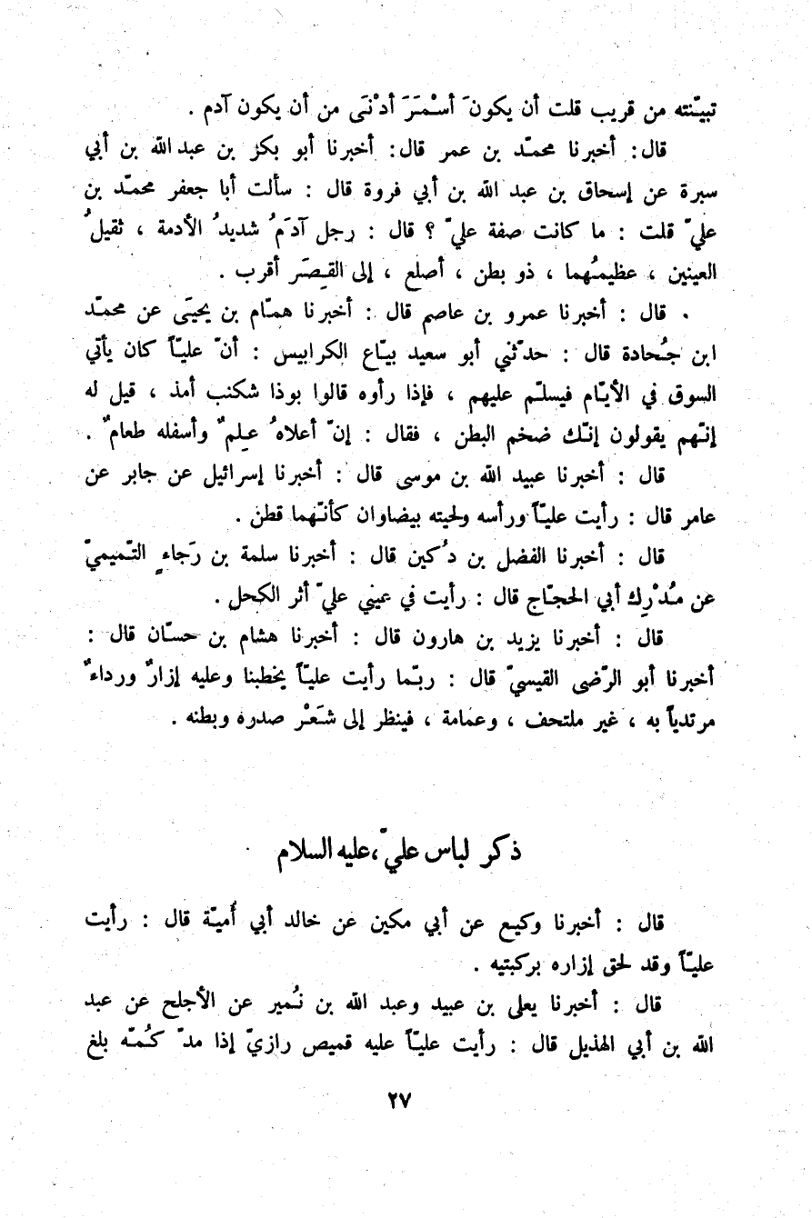 قَالَ: أَخْبَرَنَا مُحَمَّدُ بْنُ عُمَرَ قَالَ: أَخْبَرَنَا أَبُو بَكْرِ بْنُ عَبْدِ اللَّهِ بْنِ أَبِي سَبْرَةَ، عَنْ إِسْحَاقَ بْنِ عَبْدِ اللَّهِ بْنِ أَبِي فَرْوَةَ قَالَ: سَأَلْتُ أَبَا جَعْفَرٍ مُحَمَّدَ بْنَ عَلِيٍّ قُلْتُ: §مَا كَانَتْ صِفَةُ عَلِيٍّ؟ قَالَ: «رَجُلٌ آدَمُ، شَدِيدُ الْأَدَمَةِ، ثَقِيلُ الْعَيْنَيْنِ عَظِيمُهُمَا، ذُو بَطْنٍ، أَصْلَعُ، إِلَى الْقِصَرِ أَقْرَبُ»