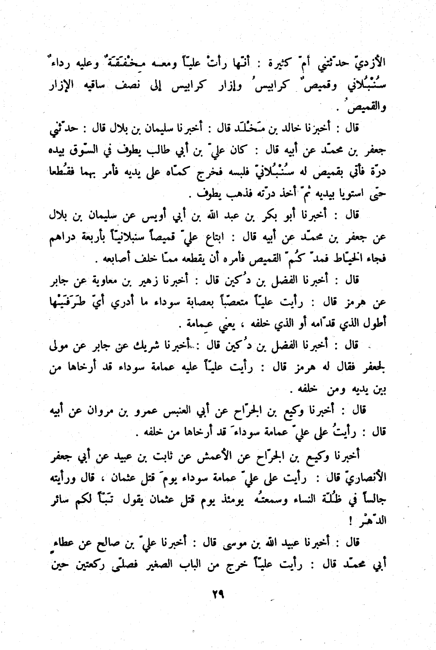 قَالَ: أَخْبَرَنَا الْفَضْلُ بْنُ دُكَيْنٍ قَالَ: أَخْبَرَنَا زُهَيْرُ بْنُ مُعَاوِيَةَ، عَنْ جَابِرٍ، عَنْ هُرْمُزَ قَالَ: «§رَأَيْتُ عَلِيًّا مُتَعَصِّبًا بِعِصَابَةٍ سَوْدَاءَ، مَا أَدْرِي أَيَّ طَرَفَيْهَا أَطْوَلَ، الَّذِي قُدَّامَهُ أَوِ الَّذِي خَلْفَهُ، يَعْنِي عِمَامَةً»