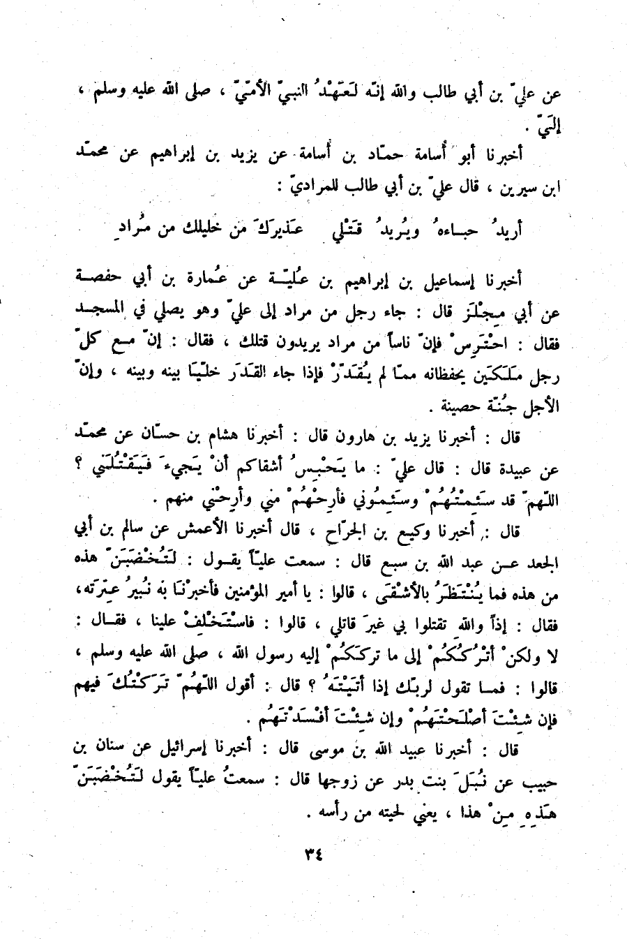 قَالَ: أَخْبَرَنَا يَزِيدُ بْنُ هَارُونَ قَالَ: أَخْبَرَنَا هِشَامُ بْنُ حَسَّانَ، عَنْ مُحَمَّدٍ، عَنْ عُبَيْدَةَ قَالَ: قَالَ عَلِيٌّ: «§مَا يَحْبِسُ أَشْقَاكُمْ أَنْ يَجِيءَ فَيَقْتُلَنِي؟ اللَّهُمَّ قَدْ سَئِمْتُهُمْ وَسَئِمُونِي، فَأَرِحْهُمْ مِنِّي، وَأَرِحْنِي مِنْهُمْ»