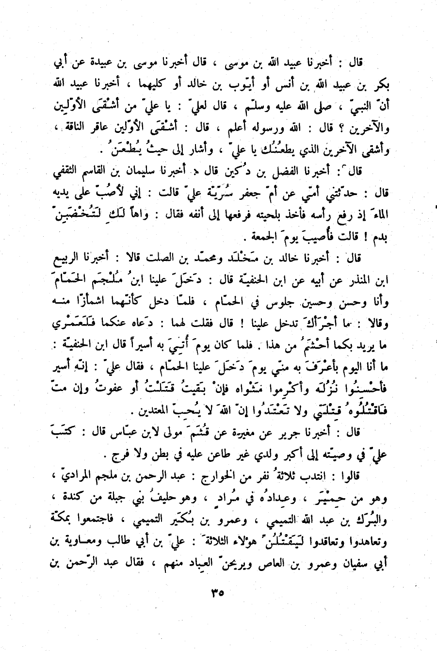 قَالَ: أَخْبَرَنَا جَرِيرٌ، عَنْ مُغِيرَةَ، عَنْ قُثَمَ مَوْلًى لِابْنِ عَبَّاسٍ قَالَ: " §كَتَبَ عَلِيٌّ فِي وَصِيَّتِهِ: «إِلَى أَكْبَرِ وَلَدِي، غَيْرُ طَاعِنٍ عَلَيْهِ فِي بَطْنٍ وَلَا فَرْجٍ» قَالُوا: انْتُدِبَ ثَلَاثَةُ نَفَرٍ مِنَ الْخَوَارِجِ: عَبْدُ الرَّحْمَنِ بْنِ مُلْجَمٍ الْمُرَادِيُّ وَهُوَ مِنْ حِمْيَرَ، وِعِدِادُهُ فِي مُرَادٍ وَهُوَ حَلِيفُ بَنِي جَبَلَةَ مِنْ كِنْدَةَ , وَالْبُرَكُ بْنُ عَبْدِ اللَّهِ التَّمِيمِيُّ , وَعَمْرُو بْنُ بُكَيْرٍ التَّمِيمِيُّ , فَاجْتَمَعُوا بِمَكَّةَ وَتَعَاهَدُوا وَتَعَاقَدُوا لَيُقْتَلَنَّ هَؤُلَاءِ الثَّلَاثَةَ: عَلِيَّ بْنَ أَبِي طَالِبٍ , وَمُعَاوِيَةَ بْنَ أَبِي سُفْيَانَ , وَعَمْرَو بْنَ الْعَاصِ , وَيُرِيحَنَّ الْعِبَادَ مِنْهُمْ , فَقَالَ عَبْدُ الرَّحْمَنِ بْنُ