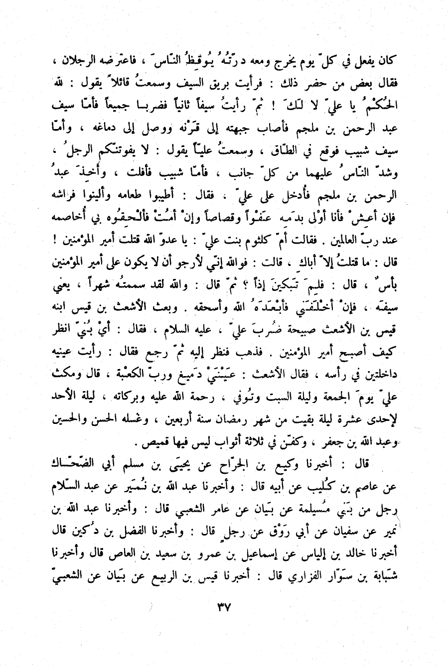 كَانَ يَفْعَلُ فِي كُلِّ يَوْمٍ، يَخْرُجُ وَمَعَهُ دِرَّتُهُ يُوقِظُ النَّاسَ، فَاعْتَرَضَهُ الرَّجُلَانِ، فَقَالَ بَعْضُ مَنْ حَضَرَ ذَلِكَ: فَرَأَيْتُ بَرِيقَ السَّيْفِ , وَسَمِعْتُ قَائِلًا يَقُولُ: لِلَّهِ الْحُكْمُ يَا عَلِيُّ , لَا لَكَ، ثُمَّ رَأَيْتُ سَيْفًا ثَانِيًا، فَضَرَبَا جَمِيعًا، فَأَمَّا سَيْفُ عَبْدِ الرَّحْمَنِ بْنُ مُلْجَمٍ فَأَصَابَ جَبْهَتَهُ إِلَى قَرْنِهِ وَوَصَلَ إِلَى دِمَاغِهِ , وَأَمَّا سَيْفُ شَبِيبٍ فَوَقَعَ فِي الطَّاقِ , وَسَمِعْتُ عَلِيًّا يَقُولُ: لَا يَفُوتَنَّكُمُ الرَّجُلُ، وَشَدَّ النَّاسُ عَلَيْهِمَا مِنْ كُلِّ جَانِبٍ، فَأَمَّا شَبِيبٌ فَأَفْلَتَ، وَأُخِذَ عَبْدُ الرَّحْمَنِ بْنُ مُلْجَمٍ , فَأُدْخِلَ عَلَى عَلِيٍّ فَقَالَ: أَطِيبُوا طَعَامَهُ وَأَلِينُوا فِرَاشَهُ , فَإِنْ أَعِشْ فَأَنَا أَوْلَى بِدَمِهِ عَفْوًا وَقِصَاصًا، وَإِنْ أَمُتْ فَأَلْحِقُوهُ بِي أُخَاصِمُهُ عِنْدَ رَبِّ الْعَالَمِينَ , فَقَالَتْ أُمُّ كُلْثُومِ بِنْتُ عَلِيٍّ: يَا عَدُوَّ اللَّهِ، قَتَلْتَ أَمِيرَ الْمُؤْمِنِينَ , قَالَ: مَا قَتَلْتُ إِلَّا أَبَاكِ , قَالَتْ: فَوَاللَّهِ إِنِّي لَأَرْجُو أَنْ لَا يَكُونَ عَلَى أَمِيرِ الْمُؤْمِنِينَ بَأْسٌ , قَالَ: فَلِمَ تَبْكِينَ إِذًا؟ ثُمَّ قَالَ , وَاللَّهِ لَقَدْ سَمَمْتُهُ شَهْرًا , يَعْنِي سَيْفَهُ، فَإِنْ أَخْلَفَنِي فَأَبْعَدَهُ اللَّهُ وَأَسْحَقَهُ. وَبَعَثَ الْأَشْعَثُ بْنُ قَيْسٍ ابْنَهُ قَيْسَ بْنَ الْأَشْعَثِ صَبِيحَةَ ضَرْبِ عَلِيٍّ عَلَيْهِ السَّلَامُ , فَقَالَ: أَيْ بُنَيَّ، انْظُرْ كَيْفَ أَصْبَحَ أَمِيرُ الْمُؤْمِنِينَ , فَذَهَبَ فَنَظَرَ إِلَيْهِ ثُمَّ رَجَعَ فَقَالَ: رَأَيْتُ عَيْنَيْهَ دَاخِلَتَيْنِ فِي رَأْسِهِ، فَقَالَ الْأَشْعَثُ: عَيْنَيْ دَمِيغٍ وَرَبِّ الْكَعْبَةِ. قَالَ: وَمَكَثَ عَلِيٌّ يَوْمَ الْجُمُعَةِ وَلَيْلَةَ السَّبْتِ , وَتُوُفِّيَ، رَحْمَةُ اللَّهِ عَلَيْهِ وَبَرَكَاتُهُ، لَيْلَةَ الْأَحَدِ لِإِحْدَى عَشْرَةَ لَيْلَةً بَقِيَتْ مِنْ شَهْرِ رَمَضَانَ سَنَةَ أَرْبَعِينَ , وَغَسَّلَهُ الْحَسَنُ وَالْحُسَيْنُ وَعَبْدُ اللَّهِ بْنُ جَعْفَرٍ، وَكُفِّنَ فِي ثَلَاثَةِ أَثْوَابٍ لَيْسَ فِيهَا قَمِيصٌ