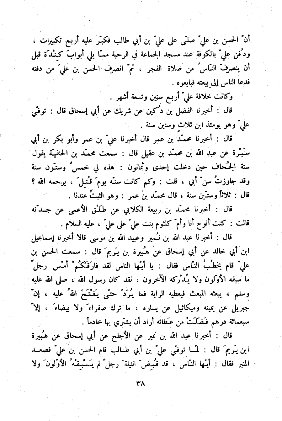 قَالَ: أَخْبَرَنَا الْفَضْلُ بْنُ دُكَيْنٍ، عَنْ شَرِيكٍ، عَنْ أَبِي إِسْحَاقَ قَالَ: «§تُوُفِّيَ عَلِيٌّ وَهُوَ يَوْمَئِذٍ ابْنُ ثَلَاثٍ وَسِتِّينَ سَنَةً»