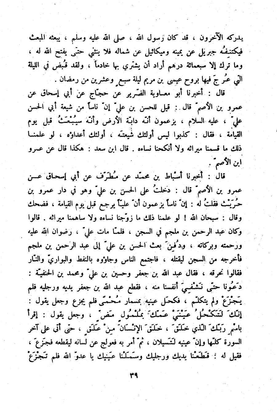قَالَ: أَخْبَرَنَا أَسْبَاطُ بْنُ مُحَمَّدٍ، عَنْ مُطَرِّفٍ، عَنْ أَبِي إِسْحَاقَ، عَنْ عَمْرِو بْنِ الْأَصَمِّ قَالَ: دَخَلْتُ عَلَى الْحَسَنِ بْنِ عَلِيٍّ وَهُوَ فِي دَارِ عَمْرِو بْنِ حُرَيْثٍ فَقُلْتُ لَهُ: إِنَّ نَاسًا §يَزْعُمُونَ أَنَّ عَلِيًّا يَرْجِعُ قَبْلَ يَوْمِ الْقِيَامَةِ، فَضَحِكَ وَقَالَ: «سُبْحَانَ اللَّهِ، لَوْ عَلِمْنَا ذَلِكَ مَا زَوَّجْنَا نِسَاءَهُ، وَلَا سَاهَمْنَا مِيرَاثَهُ» قَالُوا: وَكَانَ عَبْدُ الرَّحْمَنِ بْنُ مُلْجَمٍ فِي السِّجْنِ , فَلَمَّا مَاتَ عَلِيٌّ رِضْوَانُ اللَّهِ عَلَيْهِ وَرَحْمَتُهُ وَبَرَكَاتُهُ وَدُفِنَ , بَعَثَ الْحَسَنُ بْنُ عَلِيٍّ إِلَى عَبْدِ الرَّحْمَنِ بْنِ مُلْجَمٍ فَأَخْرَجَهُ مِنَ السِّجْنِ لِيَقْتُلَهُ , فَاجْتَمَعَ النَّاسُ وَجَاؤُوهُ بِالنِّفْطِ وَالْبَوَارِي وَالنَّارِ، فَقَالُوا: نُحَرِّقُهُ , فَقَالَ عَبْدُ اللَّهِ بْنُ جَعْفَرٍ , وَحُسَيْنُ بْنُ عَلِيٍّ , وَمُحَمَّدُ ابْنُ الْحَنَفِيَّةِ: دَعُونَا حَتَّى نَشْفِيَ أَنْفُسَنَا مِنْهُ , فَقَطَعَ عَبْدُ اللَّهِ بْنُ جَعْفَرٍ يَدَيْهِ وَرِجْلَيْهِ , فَلَمْ يَجْزَعْ وَلَمْ يَتَكَلَّمْ , فَكَحَلَ عَيْنَيْهِ بِمِسْمَارٍ مُحْمًى , فَلَمْ يَجْزَعْ وَجَعَلَ يَقُولُ: إِنَّكَ لَتَكْحُلُ عَيْنَيْ عَمِّكَ بِمُلْمُولٍ مَضٍّ , وَجَعَلَ يَقُولُ: {اقْرَأْ بِاسْمِ رَبِّكَ الَّذِي خَلَقَ خَلَقَ الْإِنْسَانَ مِنْ عَلَّقٍ} [سورة: العلق، آية رقم: 2] حَتَّى أَتَى عَلَى آخِرِ السُّورَةِ كُلِّهَا وَإِنَّ عَيْنَيْهِ لَتَسِيلَانِ، ثُمَّ أُمِرَ بِهِ فَعُولِجَ عَنْ لِسَانِهِ لِيَقْطَعَهُ فَجَزِعَ، فَقِيلَ لَهُ: قَطَعْنَا يَدَيْكَ وَرِجْلَيْكَ وَسَمَلْنَا عَيْنَيْكَ يَا عَدُوَّ اللَّهِ فَلَمْ تَجْزَعْ -[40]-، فَلَمَّا صِرْنَا إِلَى لِسَانِكَ جَزَعْتَ فَقَالَ: مَا ذَاكَ مِنِّي مِنْ جَزْعٍ إِلَّا أَنِّي أَكْرَهُ أَنْ أَكُونَ فِي الدُّنْيَا فُوَاقًا لَا أَذْكُرُ اللَّهَ، فَقَطَعُوا لِسَانَهُ ثُمَّ جَعَلُوهُ فِي قَوْصَرَةٍ وَأَحْرَقُوهُ بِالنَّارِ. وَالْعَبَّاسُ بْنُ عَلِيٍّ يَوْمَئِذٍ صَغِيرٌ فَلَمْ يُسْتَأَنُ بِهِ بُلُوغُهُ , وَكَانَ عَبْدُ الرَّحْمَنِ بْنُ مُلْجَمٍ رَجُلًا أَسْمَرَ، حَسَنَ الْوَجْهِ، أَفْلَجَ شَعْرِهِ مَعَ شَحْمَةِ أُذُنَيْهِ، فِي جَبْهَتِهِ أَثَرُ السُّجُودِ , قَالُوا: وَذَهَبَ بِقَتْلِ عَلِيٍّ عَلَيْهِ السَّلَامُ إِلَى الْحِجَازِ سُفْيَانُ بْنُ أُمَيَّةَ بْنِ أَبِي سُفْيَانَ بْنِ أُمَيَّةَ بْنِ عَبْدِ شَمْسٍ فَبَلَغَ ذَلِكَ عَائِشَةَ فَقَالَتْ: