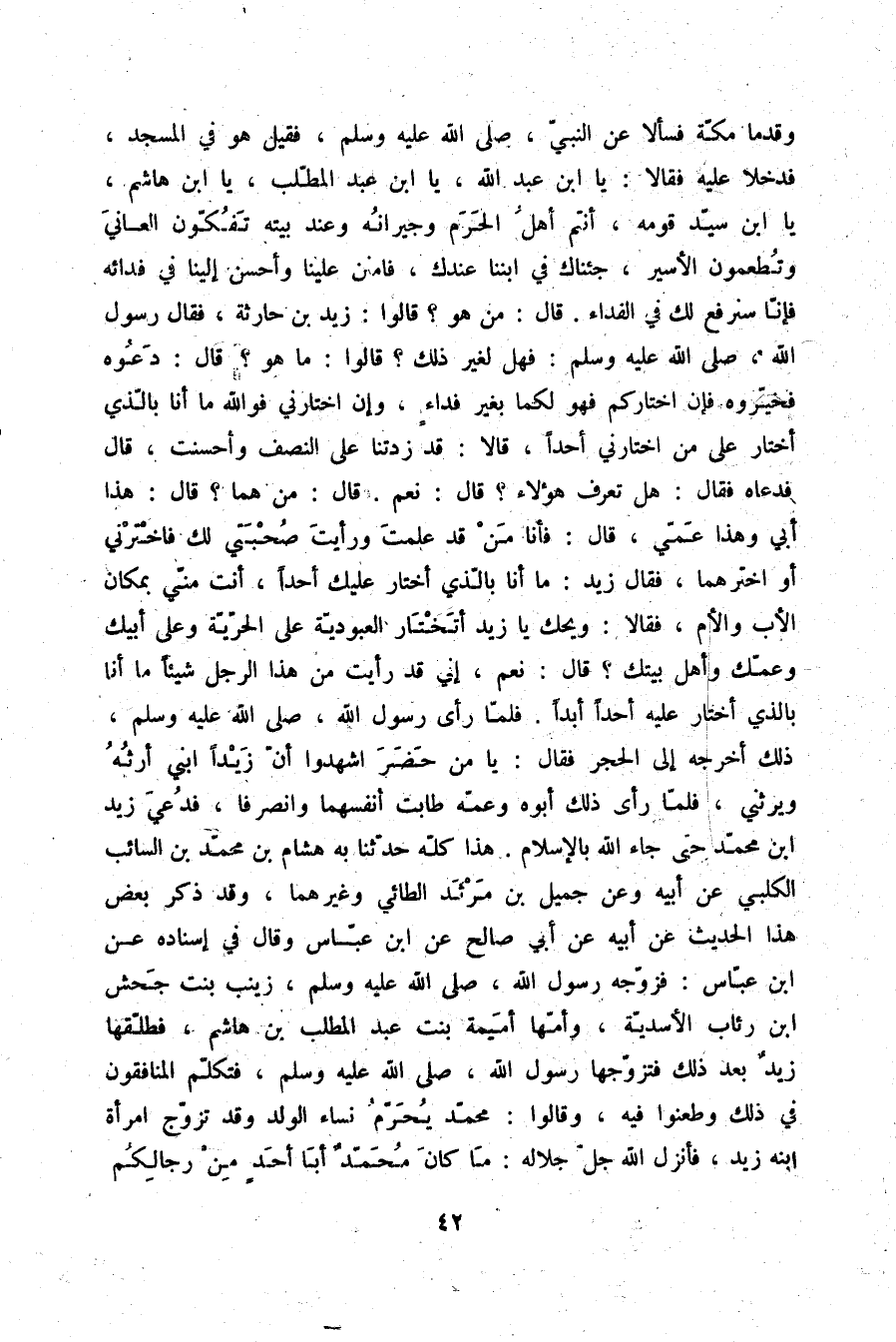، وَقَدِمَا مَكَّةَ فَسَأَلَا عَنِ النَّبِيِّ صلّى الله عليه وسلم فَقِيلَ: هُوَ فِي الْمَسْجِدِ فَدَخَلَا عَلَيْهِ فَقَالَا: يَا ابْنَ عَبْدِ اللَّهِ، يَا ابْنَ عَبْدِ الْمُطَّلِبِ، يَا ابْنَ هَاشِمٍ، يَا ابْنَ سَيِّدِ قَوْمِهِ، أَنْتُمْ أَهْلُ الْحَرَمِ وَجِيرَانُهُ، وَعِنْدَ بَيْتِهِ، تَفُكُّونَ الْعَانِيَ، وَتُطْعِمُونَ الْأَسِيرَ، جِئْنَاكَ فِي ابْنِنَا عِنْدَكَ، فَامْنُنْ عَلَيْنَا، وَأَحْسِنْ إِلَيْنَا فِي فِدَائِهِ، فَإِنَّا سَنَرْفَعُ لَكَ فِي الْفِدَاءِ. قَالَ: «مَنْ هُوَ؟» قَالُوا: زَيْدُ بْنُ حَارِثَةَ , فَقَالَ رَسُولُ اللَّهِ صلّى الله عليه وسلم: «فَهَلْ لِغَيْرِ ذَلِكَ؟» ، قَالُوا: مَا هُوَ؟ ، قَالَ: «دَعُوهُ فَخَيِّرُوهُ، فَإِنِ اخْتَارَكُمْ فَهُوَ لَكُمَا بِغَيْرِ فِدَاءٍ، وَإِنِ اخْتَارَنِي فَوَاللَّهِ مَا أَنَا بِالَّذِي أَخْتَارُ عَلَى مَنِ اخْتَارَنِي أَحَدًا» . قَالَا: قَدْ زِدْتَنَا عَلَى النَّصَفِ وَأَحْسَنْتَ , قَالَ: فَدَعَاهُ فَقَالَ: «هَلْ تَعْرِفُ هَؤُلَاءِ؟» قَالَ: نَعَمْ , قَالَ: «مَنْ هُمَا؟» ، قَالَ: هَذَا أَبِي، وَهَذَا عَمِّي، قَالَ: «فَأَنَا مَنْ قَدْ عَلِمْتَ، وَرَأَيْتَ صُحْبَتِي لَكَ، فَاخْتَرْنِي أَوِ اخْتَرْهُمَا» ، فَقَالَ زَيْدٌ: مَا أَنَا بِالَّذِي أَخْتَارُ عَلَيْكَ أَحَدًا، أَنْتَ مِنِّي بِمَكَانِ الْأَبِّ وَالْأُمِّ , فَقَالَا: وَيْحَكَ يَا زَيْدُ، أَتَخْتَارُ العُبُّودِيَّةَ عَلَى الْحُرِّيَّةِ , وَعَلَى أَبِيكَ وَعَمِّكَ وَأَهْلِ بَيْتِكَ؟ ، قَالَ: نَعَمْ , إِنِّي قَدْ رَأَيْتُ مِنَ هَذَا الرَّجُلِ شَيْئًا مَا أَنَا بِالَّذِي أَخْتَارُ عَلَيْهِ أَحَدًا أَبَدًا، فَلَمَّا رَأَى رَسُولُ اللَّهِ صلّى الله عليه وسلم ذَلِكَ أَخْرَجَهُ إِلَى الْحِجْرِ فَقَالَ: «يَا مَنْ حَضَرَ، اشْهَدُوا أَنَّ زَيْدًا ابْنِي أَرِثُهُ وَيَرِثُنِي» , فَلَمَّا رَأَى ذَلِكَ أَبُوهُ وَعَمُّهُ طَابَتْ أَنْفُسُهُمَا وَانْصَرَفَا، فَدُعِيَ: زَيْدُ بْنُ مُحَمَّدٍ حَتَّى جَاءَ اللَّهُ بِالْإِسْلَامِ. هَذَا كُلُّهُ حَدَّثَنَا بِهِ هِشَامُ بْنُ مُحَمَّدِ بْنِ السَّائِبِ الْكَلْبِيُّ عَنْ أَبِيهِ، وَعَنْ جَمِيلِ بْنِ مَرْثَدٍ الطَّائِيِّ وَغَيْرِهِمَا، وَقَدْ ذَكَرَ بَعْضَ هَذَا الْحَدِيثِ عَنْ أَبِيهِ عَنْ أَبِي صَالِحٍ عَنِ ابْنِ عَبَّاسٍ , وَقَالَ فِي إِسْنَادِهِ عَنِ ابْنِ عَبَّاسٍ: فَزَوَّجَهُ رَسُولُ اللَّهِ صلّى الله عليه وسلم زَيْنَبَ بِنْتَ جَحْشِ بْنِ رِئَابٍ الْأَسَدِيَّةَ وَأُمُّهَا أُمَيْمَةُ بِنْتُ عَبْدِ الْمُطَّلِبِ بْنِ هَاشِمٍ فَطَلَّقَهَا زَيْدٌ بَعْدَ ذَلِكَ , فَتَزَوَّجَهَا رَسُولُ اللَّهِ صلّى الله عليه وسلم , فَتَكَلَّمَ الْمُنَافِقُونَ فِي ذَلِكَ وَطَعَنُوا فِيهِ , وَقَالُوا: مُحَمَّدٌ يُحَرِّمُ نِسَاءَ الْوَلَدِ وَقَدْ تَزَوَّجَ امْرَأَةَ ابْنِهِ زَيْدٍ , فَأَنْزَلَ اللَّهُ جَلَّ جَلَالُهُ مَا كَانَ مُحَمَّدٌ أَبَا أَحَدٍ مِنْ رِجَالِكُمْ