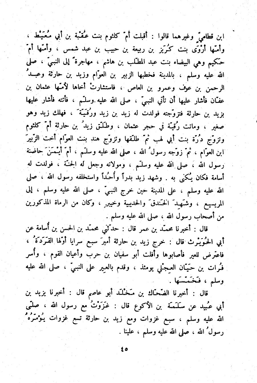 بْنِ قَطَامِيٍّ، وَغَيْرِهِمَا قَالُوا: «أَقْبَلَتْ أُمُّ كُلْثُومِ بِنْتُ عُقْبَةَ بْنِ أَبِي مُعَيْطٍ , وَأُمُّهَا أَرْوَى بِنْتُ كَرِيزِ بْنِ رَبِيعَةَ بْنِ حَبِيبِ بْنِ عَبْدِ شَمْسٍ , وَأُمُّهَا أُمُّ حَكِيمٍ وَهِيَ الْبَيْضَاءُ بِنْتُ عَبْدِ الْمُطَّلِبِ بْنِ هَاشِمٍ مُهَاجِرَةً إِلَى النَّبِيِّ صلّى الله عليه وسلم بِالْمَدِينَةِ فَخَطَبَهَا الزُّبَيْرُ بْنُ الْعَوَّامِ , وَزَيْدُ بْنُ حَارِثَةَ , وَعَبْدُ الرَّحْمَنِ بْنُ عَوْفٍ , وَعَمْرُو بْنُ الْعَاصِ، فَاسْتَشَارَتْ أَخَاهَا لِأُمِّهَا عُثْمَانَ بْنَ عَفَّانَ فَأَشَارَ عَلَيْهَا أَنْ تَأْتِيَ النَّبِيَّ صلّى الله عليه وسلم , فَأَتَتْهُ §فَأَشَارَ عَلَيْهَا بِزَيْدِ بْنِ حَارِثَةَ فَتَزَوَّجَتْهُ، فَوَلَدَتْ لَهُ زَيْدَ بْنَ زَيْدٍ وَرُقَيَّةَ، فَهَلَكَ زَيْدٌ وَهُوَ صَغِيرٌ، وَمَاتَتْ رُقْيَةُ فِي حِجْرِ عُثْمَانَ، وَطَلَّقَ زَيْدُ بْنُ حَارِثَةَ أُمَّ كُلْثُومٍ , وَتَزَوَّجَ دُرَّةَ بِنْتَ أَبِي لَهَبٍ , ثُمَّ طَلَّقَهَا وَتَزَوَّجَ هِنْدَ بِنْتَ الْعَوَّامِ أُخْتَ الزُّبَيْرِ بْنِ الْعَوَّامِ , ثُمَّ زَوَّجَهُ رَسُولُ اللَّهِ صلّى الله عليه وسلم أُمَّ أَيْمَنَ حَاضِنَةَ رَسُولِ اللَّهِ صلّى الله عليه وسلم وَمَوْلَاتَهُ , وَجَعَلَ لَهُ الْجَنَّةَ، فَوَلَدَتْ لَهُ أُسَامَةَ فَكَانَ يُكْنَى بِهِ، وَشَهِدَ زَيْدٌ بَدْرًا، وَأُحُدًا، وَاسْتَخْلَفَهُ رَسُولُ اللَّهِ صلّى الله عليه وسلم عَلَى الْمَدِينَةِ حِينَ خَرَجَ النَّبِيُّ صلّى الله عليه وسلم إِلَى الْمُرَيْسِيعِ , وَشَهِدَ الْخَنْدَقَ، وَالْحُدَيْبِيَةَ، وَخَيْبَرَ , وَكَانَ مِنَ الرُّمَاةِ الْمَذْكُورِينَ مِنْ أَصْحَابِ رَسُولِ اللَّهِ صلّى الله عليه وسلم»