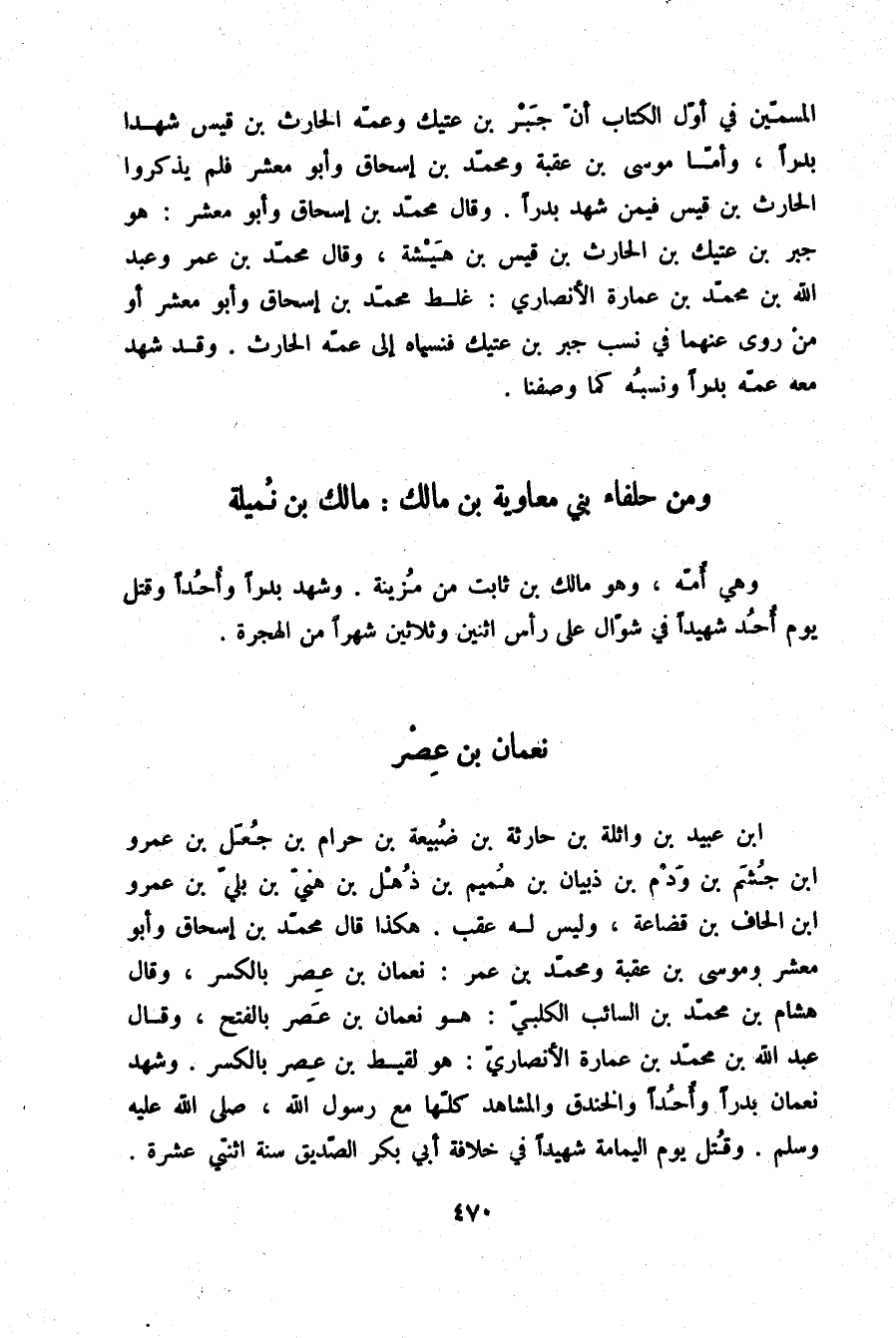 §نُعْمَانُ بْنُ عَصْرِ بْنِ عُبَيْدِ بْنِ وَائِلَةَ بْنِ حَارِثَةَ بْنِ ضُبَيْعَةَ بْنِ حَرَامِ بْنِ جُعَلَ بْنِ عَمْرِو بْنِ جُشَمَ بْنِ وَدَمِ بْنِ ذِبْيَانَ بْنِ هُمَيْمِ بْنِ ذُهْلِ بْنِ هُنَيِّ بْنِ بَلِيِّ بْنِ عَمْرِو بْنِ الْحَافِ بْنِ قُضَاعَةَ وَلَيْسَ لَهُ عَقِبٌ، هَكَذَا قَالَ مُحَمَّدُ بْنُ إِسْحَاقَ وَأَبُو مَعْشَرٍ وَمُوسَى بْنُ عُقْبَةَ وَمُحَمَّدُ بْنُ عُمَرَ: نُعْمَانُ بْنُ عِصْرٍ بِالْكَسْرِ، وَقَالَ هِشَامُ بْنُ مُحَمَّدِ بْنِ السَّائِبِ الْكَلْبِيُّ: هُوَ نُعْمَانُ بْنُ عَصْرٍ بِالْفَتْحِ، وَقَالَ عَبْدُ اللَّهِ بْنُ مُحَمَّدِ بْنِ عُمَارَةَ الْأَنْصَارِيُّ: هُوَ لَقِيطُ بْنُ عِصْرٍ بِالْكَسْرِ، وَشَهِدَ نُعْمَانُ بَدْرًا، وَأُحُدًا، وَالْخَنْدَقَ، وَالْمَشَاهِدَ كُلَّهَا مَعَ رَسُولِ اللَّهِ صلّى الله عليه وسلم، وَقُتِلَ يَوْمَ الْيَمَامَةِ شَهِيدًا فِي خِلَافَةِ أَبِي بَكْرٍ الصِّدِّيقِ سَنَةَ اثْنَتَيْ عَشْرَةَ.