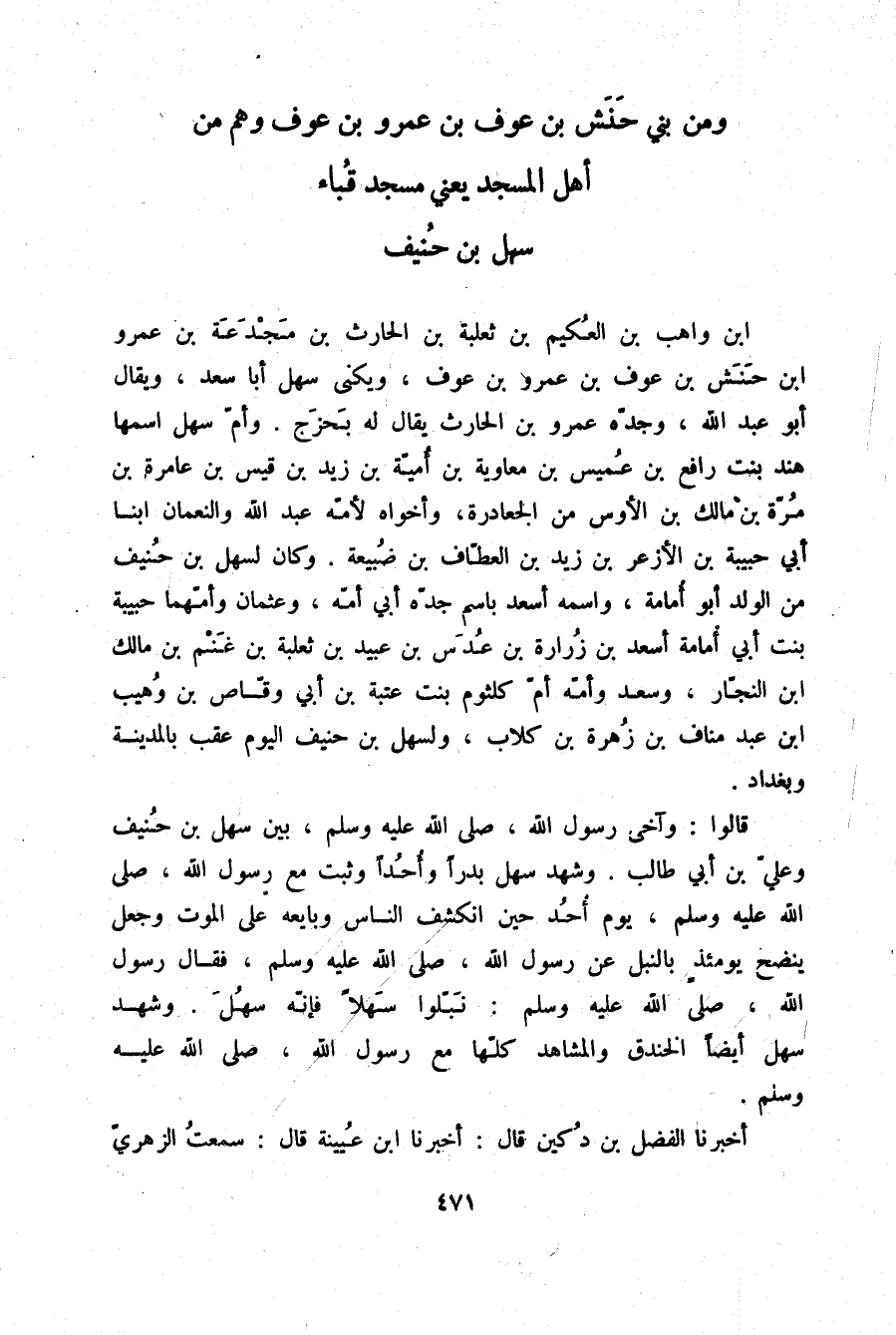 §سَهْلُ بْنُ حُنَيْفِ بْنِ وَاهِبِ بْنِ الْعَكِيمِ بْنِ ثَعْلَبَةَ بْنِ الْحَارِثِ بْنِ مَجْدَعَةَ بْنِ عَمْرِو بْنِ حَنَشِ بْنِ عَوْفِ بْنِ عَمْرِو بْنِ عَوْفٍ وَيُكْنَى سَهْلٌ أَبَا سَعْدٍ وَيُقَالُ: أَبُو عَبْدِ اللَّهِ، وَجَدُّهُ عَمْرُو بْنُ الْحَارِثِ يُقَالُ لَهُ: بَحْزَجٍ، وَأُمُّ سَهْلٍ اسْمُهَا هِنْدُ بِنْتُ رَافِعِ بْنِ عُمَيْسِ بْنِ مُعَاوِيَةَ بْنِ أُمَيَّةَ بْنِ زَيْدِ بْنِ قَيْسِ بْنِ عَامِرَةَ بْنِ مُرَّةَ بْنِ مَالِكِ بْنِ الْأَوْسِ مِنَ الْجَعَادِرَةِ، وَأَخَوَاهُ لِأُمِّهِ عَبْدُ اللَّهِ وَالنُّعْمَانُ ابْنَا أَبِي حَبِيبَةَ بْنِ الْأَزْعَرِ بْنِ زَيْدِ بْنِ الْعَطَّافِ بْنِ ضُبَيْعَةَ، وَكَانَ لِسَهْلِ بْنِ حُنَيْفٍ مِنَ الْوَلَدِ أَبُو أُمَامَةَ وَاسْمُهُ أَسْعَدُ بِاسْمِ جَدِّهِ أَبِي أُمِّهِ، وَعُثْمَانُ وَأُمُّهُمَا حَبِيبَةُ بِنْتُ أَبِي أُمَامَةَ أَسْعَدَ بْنِ زُرَارَةَ بْنِ عُدُسِ بْنِ عُبَيْدِ بْنِ ثَعْلَبَةَ بْنِ غَنْمِ بْنِ مَالِكِ بْنِ النَّجَّارِ، وَسَعْدٌ وَأُمُّهُ أُمُّ كُلْثُومِ بِنْتُ عُتْبَةَ بْنِ أَبِي وَقَّاصِ بْنِ وُهَيْبِ بْنِ عَبْدِ مَنَافِ بْنِ زُهْرَةَ بْنِ كِلَابٍ، وَلِسَهْلِ بْنِ حُنَيْفٍ الْيَوْمَ عَقِبٌ بِالْمَدِينَةِ وَبَغْدَادَ، قَالُوا: وآخَى رَسُولُ اللَّهِ صلّى الله عليه وسلم بَيْنَ سَهْلِ بْنِ حُنَيْفٍ وَعَلِيِّ بْنِ أَبِي طَالِبٍ، وَشَهِدَ سَهْلٌ بَدْرًا، وَأُحُدًا وَثَبَتَ مَعَ رَسُولِ اللَّهِ صلّى الله عليه وسلم يَوْمَ أُحُدٍ حِينَ انْكَشَفَ النَّاسُ وَبَايَعَهُ عَلَى الْمَوْتِ، وَجَعَلَ يَنْضَحُ يَوْمَئِذٍ بِالنَّبْلِ عَنْ رَسُولِ اللَّهِ صلّى الله عليه وسلم، فَقَالَ رَسُولُ اللَّهِ صلّى الله عليه وسلم: «نَبِّلُوا سَهْلًا فَإِنَّهُ سَهْلٌ» ، وَشَهِدَ سَهْلٌ أَيْضًا الْخَنْدَقَ وَالْمَشَاهِدَ كُلَّهَا مَعَ رَسُولِ اللَّهِ صلّى الله عليه وسلم.