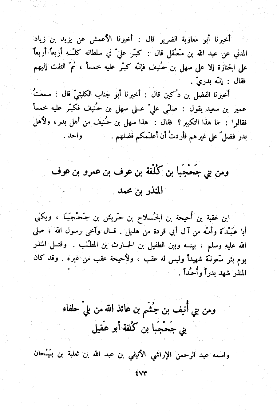 أَخْبَرَنَا الْفَضْلُ بْنُ دُكَيْنٍ قَالَ: أَخْبَرَنَا أَبُو جَنَابٍ الْكَلْبِيُّ قَالَ: سَمِعْتُ عُمَيْرَ بْنَ سَعِيدٍ يَقُولُ: " §صَلَّى عَلِيٌّ عَلَى سَهْلِ بْنِ حُنَيْفٍ فَكَبَّرَ عَلَيْهِ خَمْسًا، فَقَالُوا: مَا هَذَا التَّكْبِيرُ؟ فَقَالَ: هَذَا سَهْلُ بْنُ حُنَيْفٍ مِنْ أَهْلِ بَدْرٍ، وَلِأَهْلِ بَدْرٍ فَضْلٌ عَلَى غَيْرِهِمْ، فَأَرَدْتُ أَنْ أُعْلِمَكُمْ فَضْلَهُمْ وَاحِدٌ "
