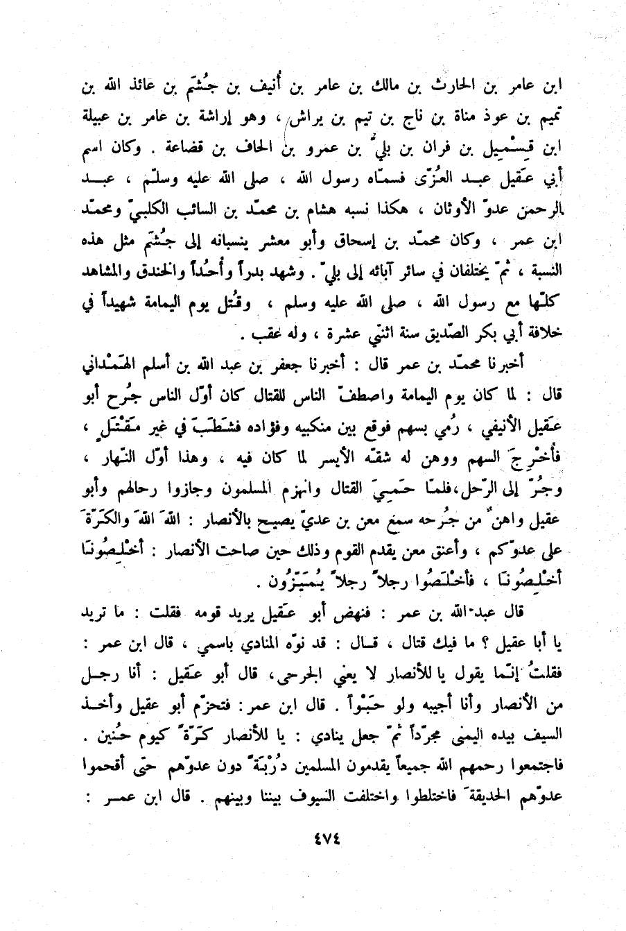 أَخْبَرَنَا مُحَمَّدُ بْنُ عُمَرَ قَالَ: أَخْبَرَنَا جَعْفَرُ بْنُ عَبْدِ اللَّهِ بْنِ أَسْلَمَ الْهَمْدَانِيُّ قَالَ: " لَمَّا كَانَ يَوْمُ الْيَمَامَةِ وَاصْطَفَّ النَّاسُ لِلْقِتَالِ، كَانَ أَوَّلَ النَّاسِ جُرِحَ أَبُو عَقِيلٍ الْأُنَيْفِيُّ، §رُمِيَ بِسَهْمٍ فَوَقَعَ بَيْنَ مَنْكِبَيْهِ وَفُؤَادِهِ فَشَطَبَ فِي غَيْرِ مَقْتَلٍ، فَأُخْرِجَ السَّهْمُ وَوَهَنَ لَهُ شِقُّهُ الْأَيْسَرِ لِمَا كَانَ فِيهِ، وَهَذَا أَوَّلُ النَّهَارِ، وَجُرَّ إِلَى الرَّحْلِ، فَلَمَّا حَمِيَ الْقِتَالُ وَانْهَزَمَ الْمُسْلِمُونَ وَجَازُوا رِحَالَهُمْ وَأَبُو عَقِيلٍ وَاهِنٌ مِنْ جُرْحِهِ، سَمِعَ مَعْنَ بْنَ عَدِيٍّ يَصِيحُ بِالْأَنْصَارِ: " اللَّهَ اللَّهَ، وَالْكَرَّةَ عَلَى عَدُوِّكُمْ، وَأَعْنَقَ مَعْنٌ يَقْدُمُ الْقَوْمَ، وَذَلِكَ حِينَ صَاحَتِ الْأَنْصَارُ: أَخْلِصُونَا أَخْلِصُونَا، فَأَخْلَصُوا رَجُلًا رَجُلًا يُمَيَّزُونَ. قَالَ عَبْدُ اللَّهِ بْنُ عُمَرَ: فَنَهَضَ أَبُو عَقِيلٍ يُرِيدُ قَوْمَهُ فَقُلْتُ: مَا تُرِيدُ يَا أَبَا عَقِيلٍ؟ مَا فِيكَ قِتَالٌ، قَالَ: قَدْ نَوَّهَ الْمُنَادِي بِاسْمِي "، قَالَ ابْنُ عُمَرَ: فَقُلْتُ: إِنَّمَا يَقُولُ: يَا لِلْأَنْصَارِ، لَا يَعْنِي الْجَرْحَى، قَالَ أَبُو عَقِيلٍ: أَنَا رَجُلٌ مِنَ الْأَنْصَارِ، وَأَنَا أُجِيبُهُ وَلَوْ حَبْوًا، قَالَ ابْنُ عُمَرَ: فَتَحَزَّمَ أَبُو عَقِيلٍ وَأَخَذَ السَّيْفَ بِيَدِهِ الْيُمْنَى مُجَرَّدًا ثُمَّ جَعَلَ يُنَادِي: يَا لِلْأَنْصَارِ، كَرَّةً كَيَوْمِ حُنَيْنٍ، فَاجْتَمَعُوا رَحِمَهُمُ اللَّهُ جَمِيعًا يَقْدُمُونَ الْمُسْلِمِينَ دُرْبَةً دُونَ عَدُوِّهِمْ حَتَّى أَقْحَمُوا عَدُّوَهُمُ الْحَدِيقَةَ فَاخْتَلَطُوا وَاخْتَلَفَتِ السُّيُوفُ بَيْنَنَا وَبَيْنَهُمْ، قَالَ ابْنُ عُمَرَ
