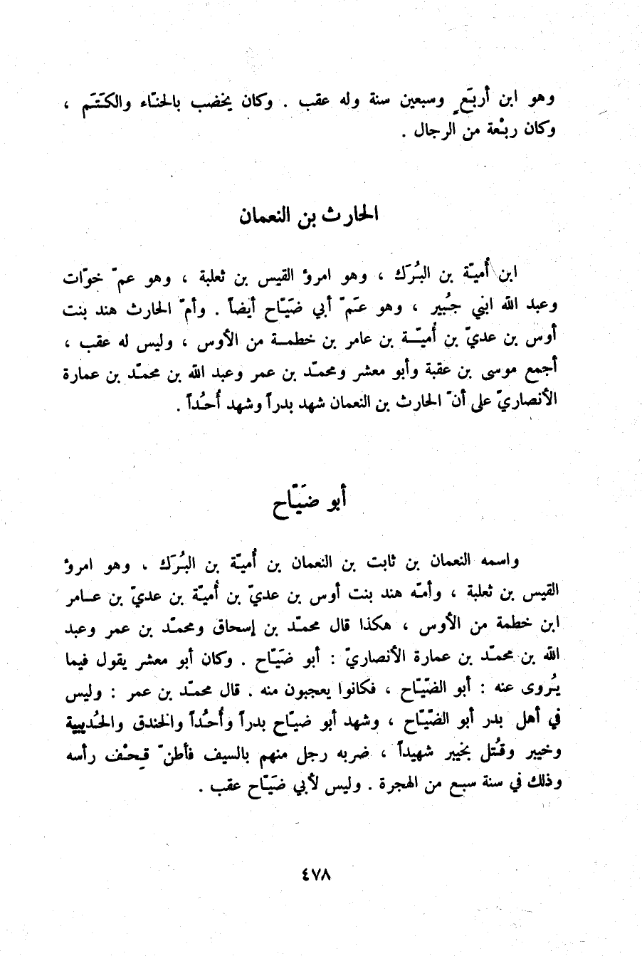 §أَبُو ضَيَّاحٍ وَاسْمُهُ النُّعْمَانُ بْنُ ثَابِتِ بْنِ النُّعْمَانِ بْنِ أُمَيَّةَ بْنِ الْبُرَكِ وَهُوَ امْرُؤُ الْقَيْسِ بْنُ ثَعْلَبَةَ وَأُمُّهُ هِنْدُ بِنْتُ أَوْسِ بْنِ عَدِيِّ بْنِ أُمَيَّةَ بْنِ عَدِيِّ بْنِ عَامِرِ بْنِ خَطْمَةَ مِنَ الْأَوْسِ، هَكَذَا قَالَ مُحَمَّدُ بْنُ إِسْحَاقَ وَمُحَمَّدُ بْنُ عُمَرَ وَعَبْدُ اللَّهِ بْنُ مُحَمَّدِ بْنِ عُمَارَةَ الْأَنْصَارِيُّ: أَبُو ضَيَّاحٍ، وَكَانَ أَبُو مَعْشَرٍ يَقُولُ فِيمَا يُرْوَى عَنْهُ: أَبُو الضَّيَّاحِ، فَكَانُوا يَعْجَبُونَ مِنْهُ. قَالَ مُحَمَّدُ بْنُ عُمَرَ: وَلَيْسَ فِي أَهْلِ بَدْرٍ أَبُو الضَّيَّاحِ، وَشَهِدَ أَبُو ضَيَّاحٍ بَدْرًا، وَأُحُدًا، وَالْخَنْدَقَ، وَالْحُدَيْبِيَةَ، وَخَيْبَرَ، وَقُتِلَ بِخَيْبَرَ شَهِيدًا، ضَرَبَهُ رَجُلٌ مِنْهُمْ بِالسَّيْفِ فَأَطَنَّ قِحْفَ رَأْسِهِ، وَذَلِكَ فِي سَنَةِ سَبْعٍ مِنَ الْهِجْرَةِ، وَلَيْسَ لِأَبِي ضَيَّاحٍ عَقِبٌ.