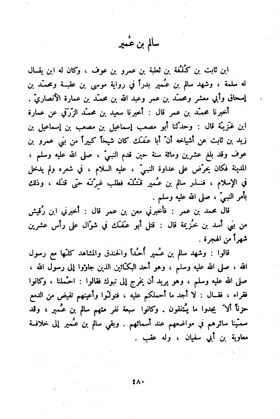 §سَالِمُ بْنُ عُمَيْرِ بْنِ ثَابِتِ بْنِ كُلْفَةَ بْنِ ثَعْلَبَةَ بْنِ عَمْرِو بْنِ عَوْفٍ وَكَانَ لَهُ ابْنٌ يُقَالُ لَهُ: سَلَمَةُ، وَشَهِدَ سَالِمُ بْنُ عُمَيْرٍ بَدْرًا فِي رِوَايَةِ مُوسَى بْنِ عُقْبَةَ وَمُحَمَّدِ بْنِ إِسْحَاقَ وَأَبِي مَعْشَرٍ وَمُحَمَّدِ بْنِ عُمَرَ وَعَبْدِ اللَّهِ بْنِ مُحَمَّدِ بْنِ عُمَارَةَ الْأَنْصَارِيِّ.