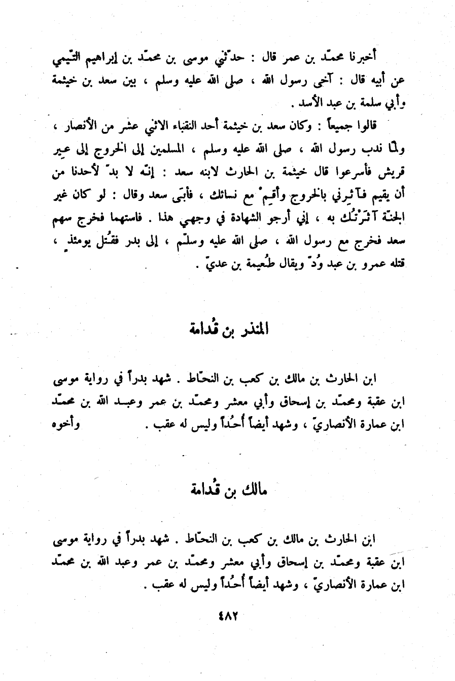 أَخْبَرَنَا مُحَمَّدُ بْنُ عُمَرَ قَالَ: حَدَّثَنِي مُوسَى بْنُ مُحَمَّدِ بْنِ إِبْرَاهِيمَ التَّيْمِيُّ، عَنْ أَبِيهِ قَالَ: «§آخَى رَسُولُ اللَّهِ صلّى الله عليه وسلم بَيْنَ سَعْدِ بْنِ خَيْثَمَةَ وَأَبِي سَلَمَةَ بْنِ عَبْدِ الْأَسَدِ» قَالُوا جَمِيعًا: وَكَانَ سَعْدُ بْنُ خَيْثَمَةَ أَحَدُ النُّقَبَاءِ الِاثْنَيْ عَشَرَ مِنَ الْأَنْصَارِ، وَلَمَّا نَدَبَ رَسُولُ اللَّهِ صلّى الله عليه وسلم الْمُسْلِمِينَ إِلَى الْخُرُوجِ إِلَى عِيرِ قُرَيْشٍ فَأَسْرَعُوا قَالَ خَيْثَمَةُ بْنُ الْحَارِثِ لِابْنِهِ سَعْدٍ: إِنَّهُ لَابُدَّ لِأَحَدِنَا مِنْ أَنْ يُقِيمَ فَآثِرْنِي بِالْخُرُوجِ وَأَقِمْ مَعَ نِسَائِكَ، فَأَبَى سَعْدٌ، وَقَالَ: لَوْ كَانَ غَيْرُ الْجَنَّةِ آثَرْتُكَ بِهِ، إِنِّي أَرْجُو الشَّهَادَةَ فِي وَجْهِي هَذَا، فَاسْتَهَمَا فَخَرَجَ سَهْمُ سَعْدٍ فَخَرَجَ مَعَ رَسُولِ اللَّهِ صلّى الله عليه وسلم إِلَى بَدْرٍ فَقُتِلَ يَوْمَئِذٍ، قَتَلَهُ عَمْرُو بْنُ عَبْدِ وُدٍّ، وَيُقَالُ: طُعَيْمَةُ بْنُ عَدِيٍّ.